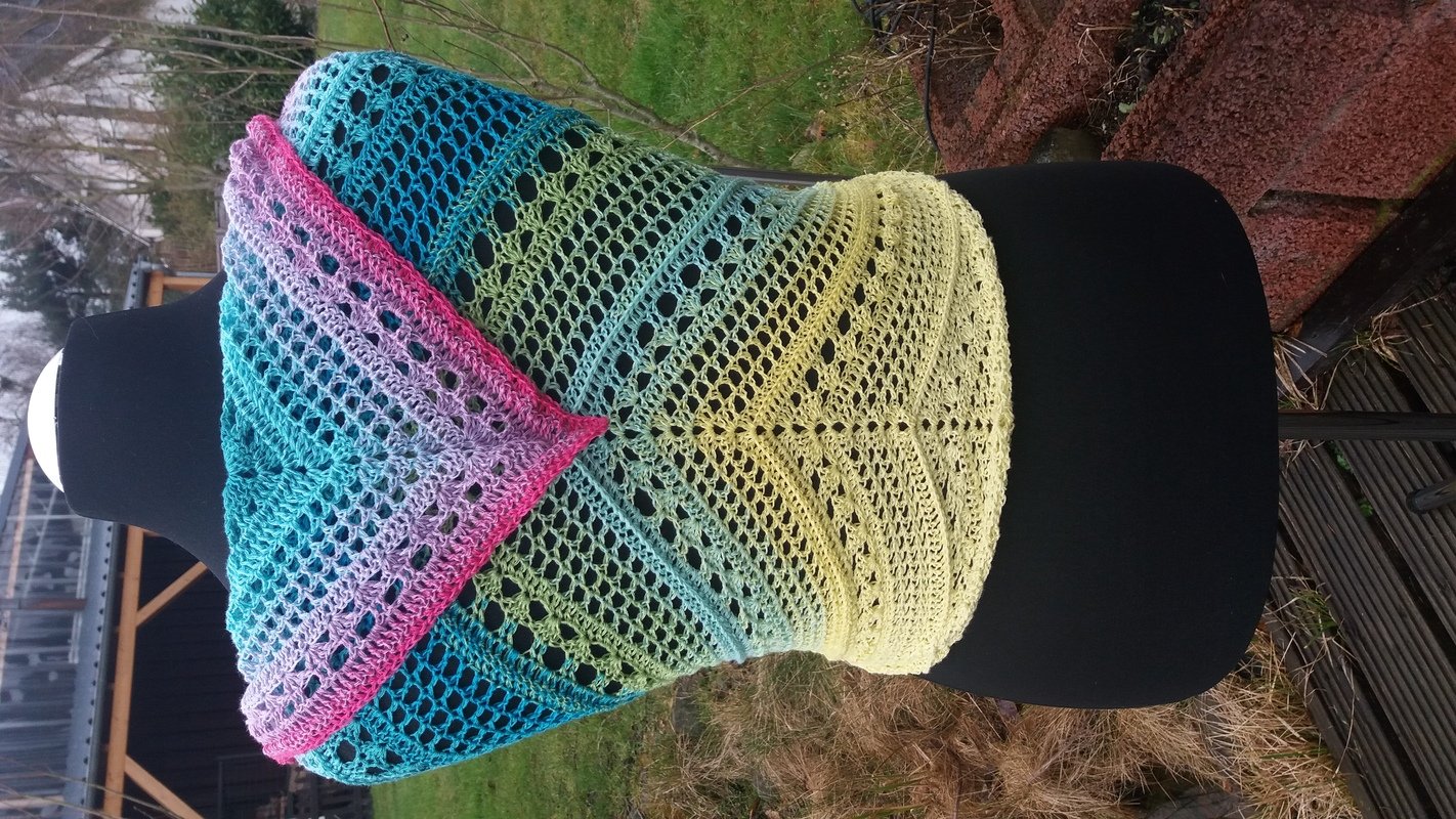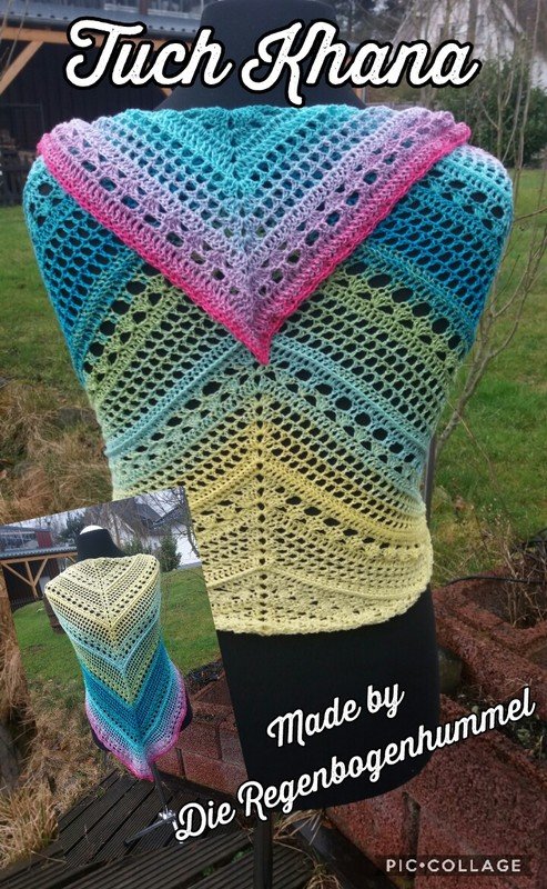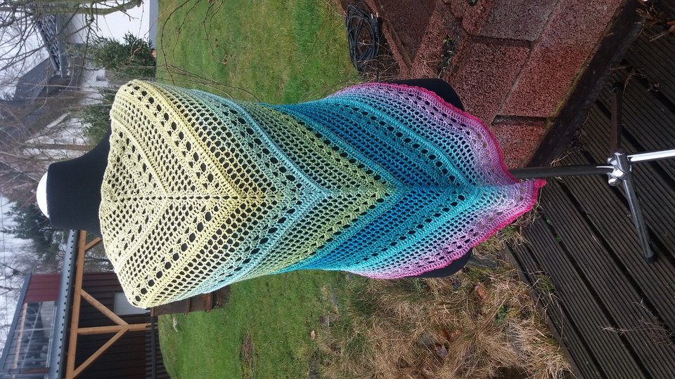Ein leichtes Sommertuch aus Verlaufsgarn. Verwendet werden kann jedes Material. Das Tuch wird mit 1000m ca 180-200cm breit.Die Anleitung ist schriftlich, bebildert und enthält eine Häkelschrift.