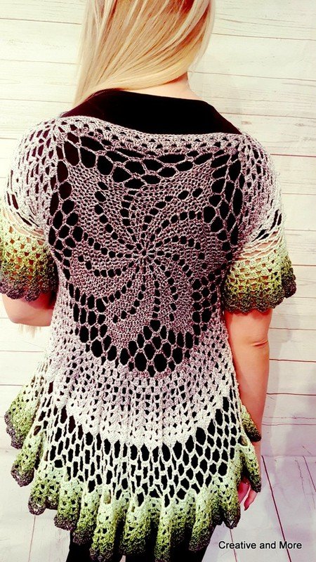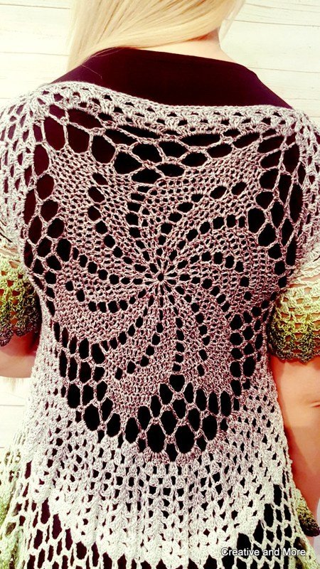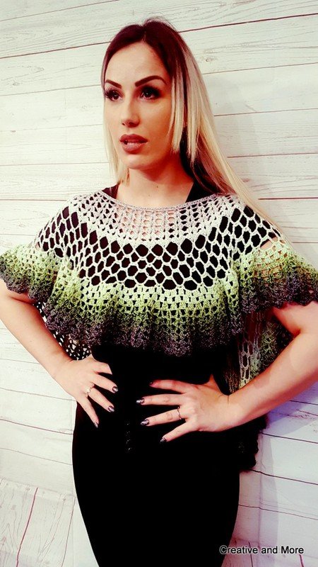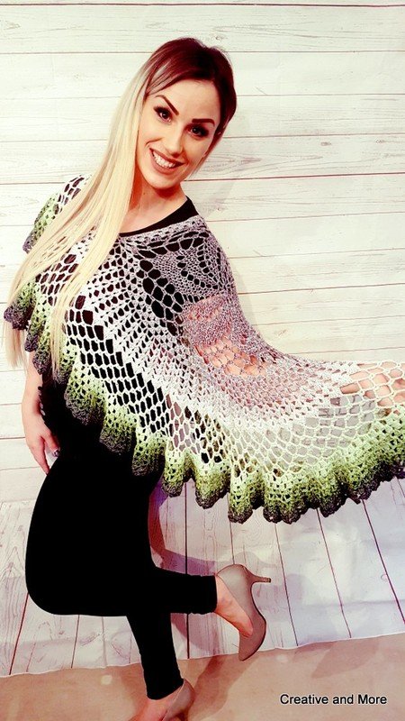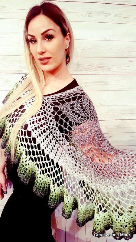 Dieser Poncho sticht durch seine asymmetrische Form und den frischen Farben absolut ins Auge. Das tolle Blattmuster auf dem Rücken ist das absolute Highlight dieses Schmuckstückes. Aber auch das 2. Muster schaut einfach nur toll aus und umschmeichelt das Hauptmuster sowie deine Figur.