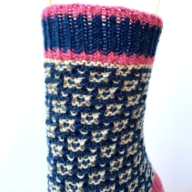 Mit diesen Socken kannst du dir die Zeit bis zum Frühlingsanfang verkürzen. Ringelstrümpfe mit Mosaikmuster kombiniert. Die Anleitung ist für die Größen 36/37 und 38/39.