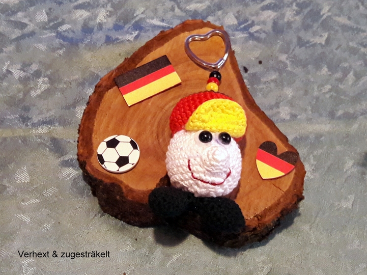 Poldi ist von Mütze bis Fuß ca 5 - 6 cm groß, je nach Garn und Nadelstärke.