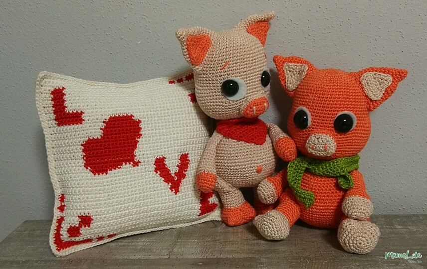 Mit dieser Häkelanleitung könnt ihr euch die im Artikelbild gezeigten Schweinchen Rose & Pepe und das Kissen „Love“ zaubern. Als Alternative gibt es ebenfalls ein Chart mit „I love You“.