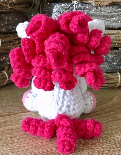 Gehäkelt ist er mit einer NS 3 und einem Garn mit ca. 112m Lauflänge auf 50g (z.B. Woll Butt Schulgarn, Gründl Cotton Quick). Mit der angegebenen Wolle wird er ca. 10 cm groß. Die Größe kann natürlich individuell über die Wolle und Nadelstärke angepasst werden.