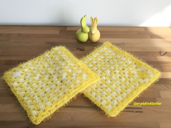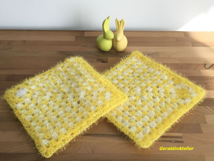 Für die abgebildeten Spülschwämme wurde 60 g Polyester gebraucht.