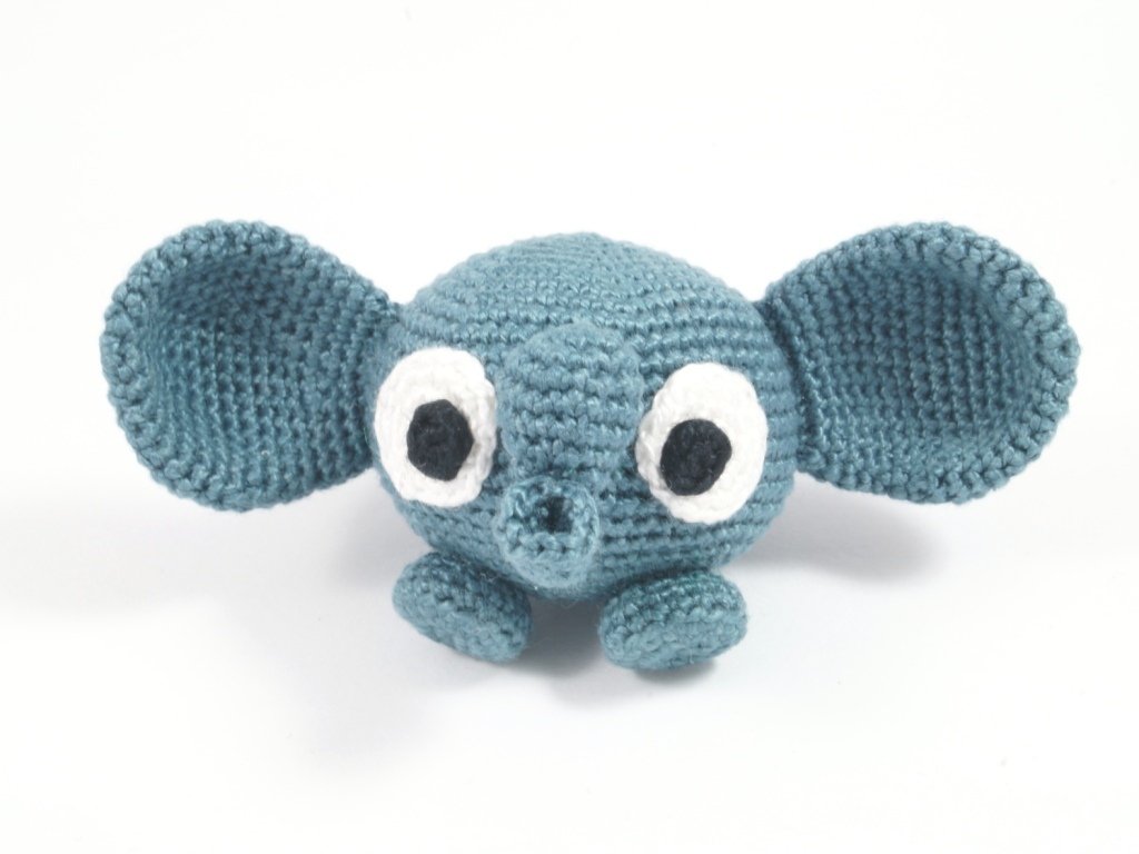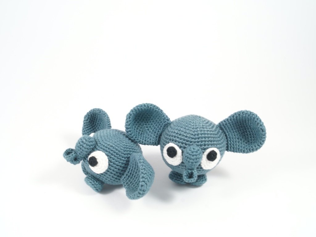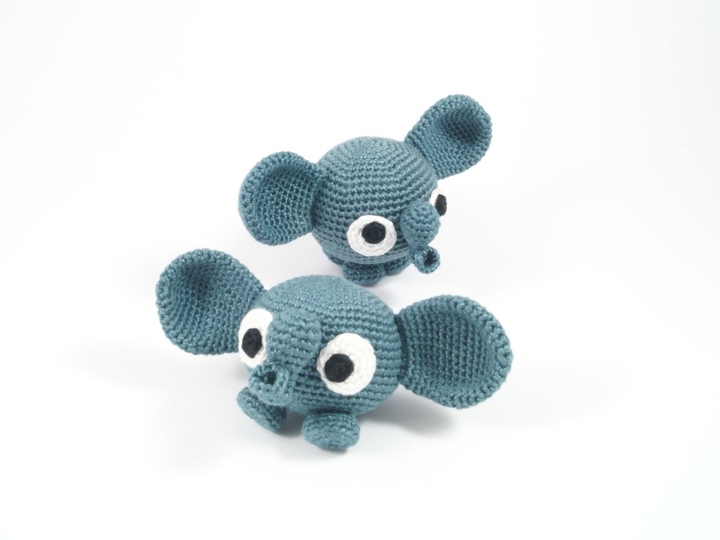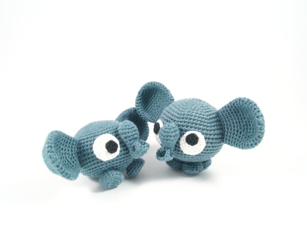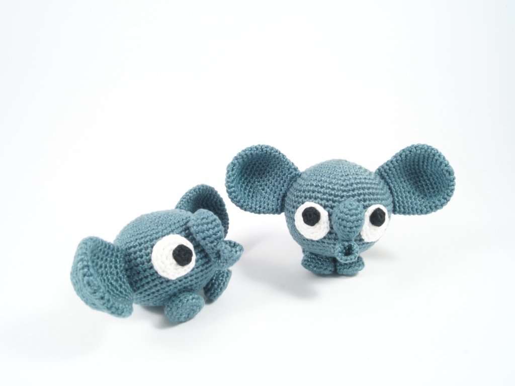 Mit Wolle Lauflänge 125 m / 50 g wird das Elefantchen ca. 7 cm im Durchmesser (ohne Ohren, ca. 14 cm mit)