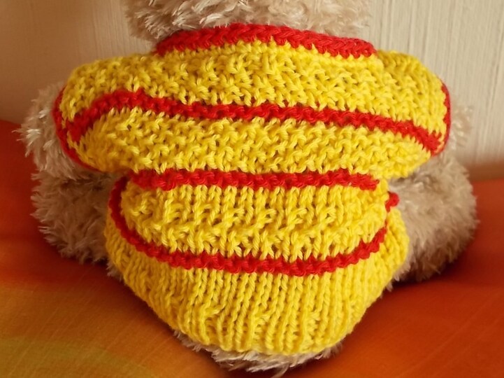 Der süße Sommer-Anzug besteht aus einem Pulli und einer sportlichen Hose. Beides lässt sich einfach aus Wollresten stricken, natürlich auch in jeder anderen Wunschfarbe.