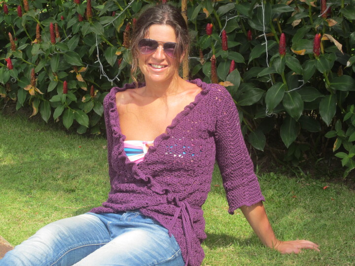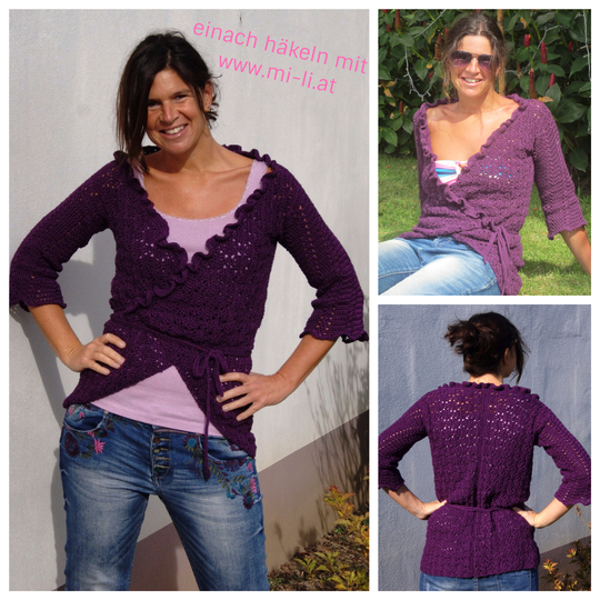 Dieser Cardigan ist superflexibel als Weste oder Wickelpulli zu tragen und ganz leicht in allen Größen nachzuhäkeln. Ob elegant oder sportlich über jedem Top - ein Must-Have zu jeder Hose oder stylisch auch zu Röcken. Der rüschige Ausschnitt ist ein zusätzlicher Hingucker!