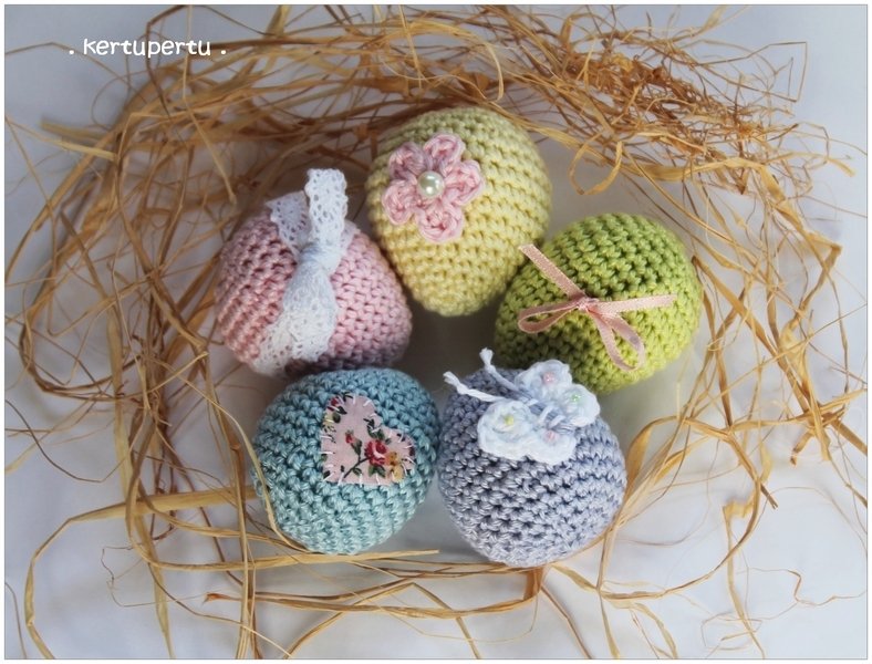 Die Eier sind etwa 5 cm gross. Die Größe hängt auch davon ab, wie fest du häkelst und welche Nadelgröße du verwendest.