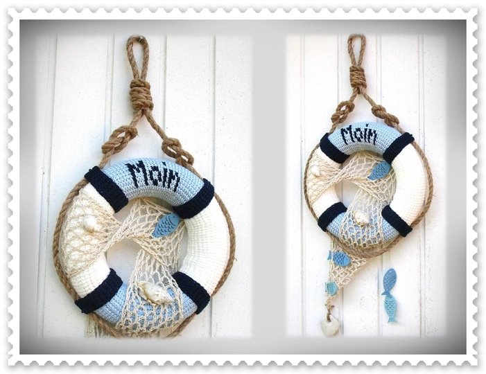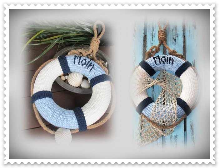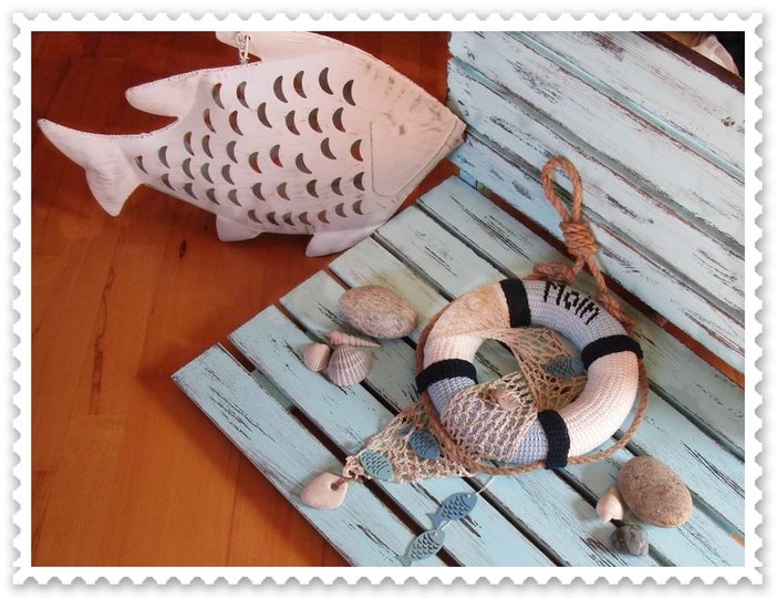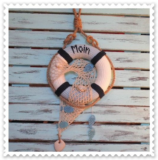 Ein Rettungsring mit eingehäkelten Moin Schriftzug wird durch ein Netz und etwas Deko Material zum originellen Hingucker im Maritim-Stil. Er erzählt von Sonne, Sand und Meer und lässt Urlaubsgefühle erwachen.