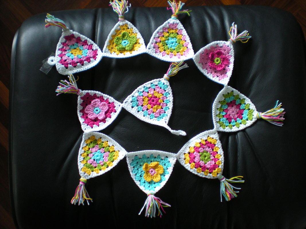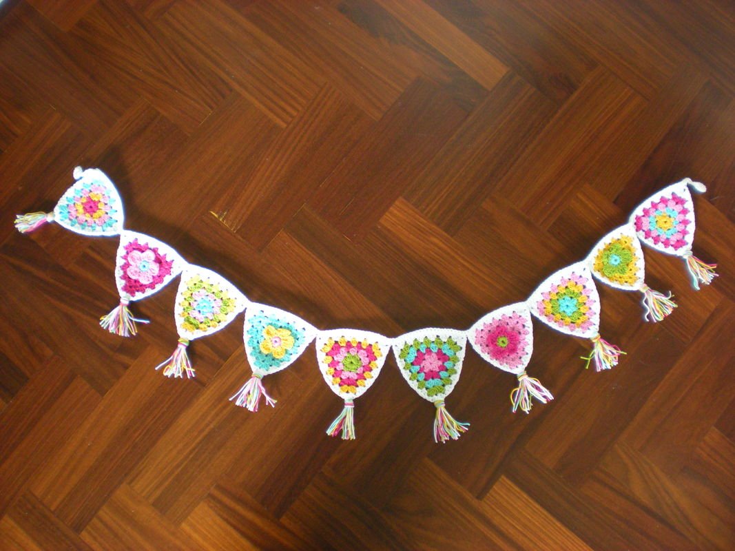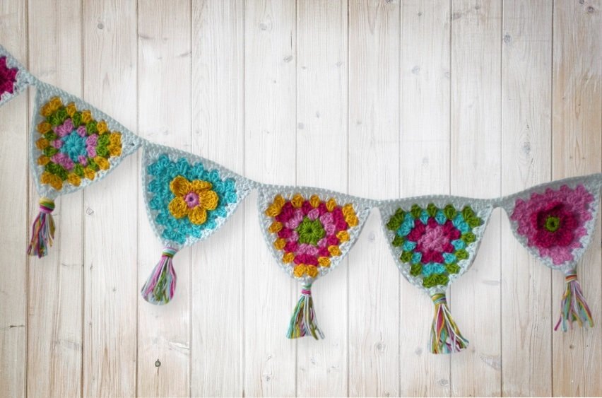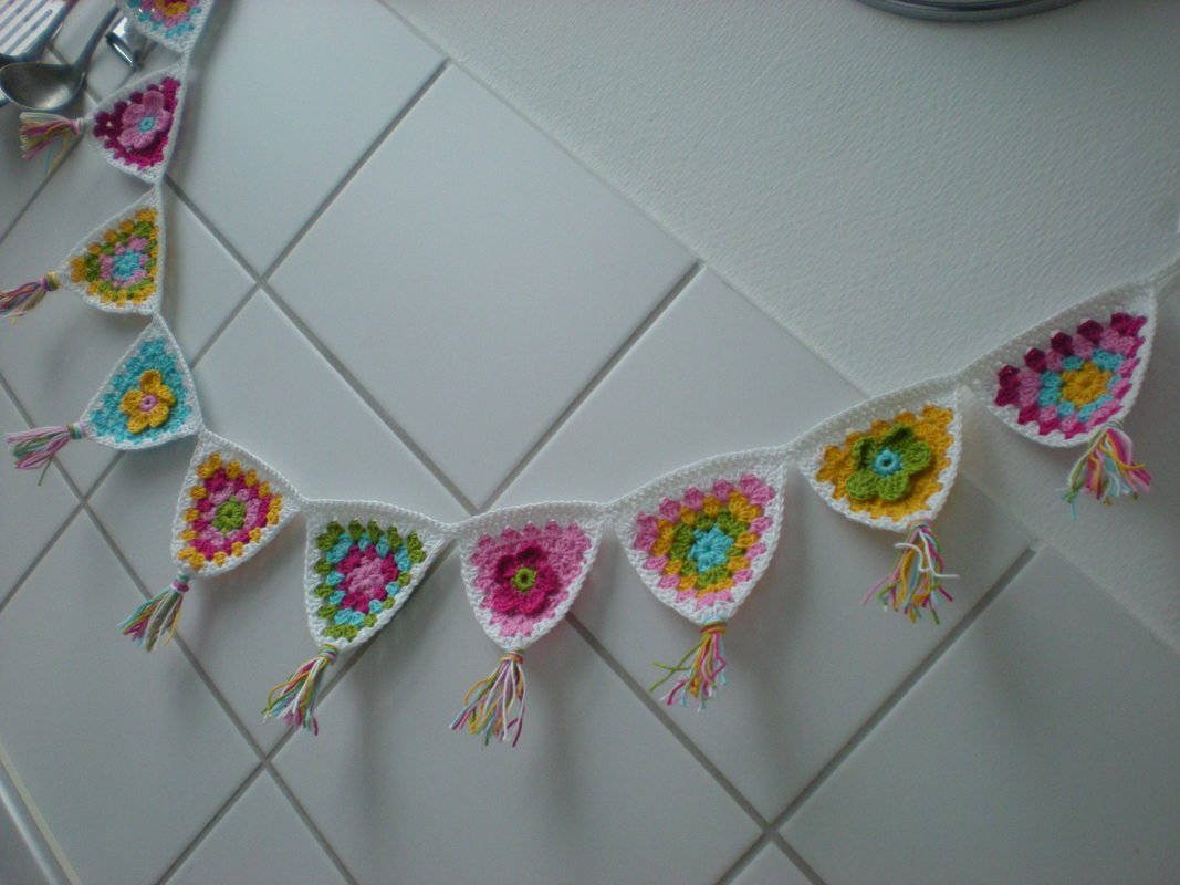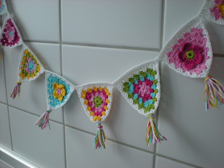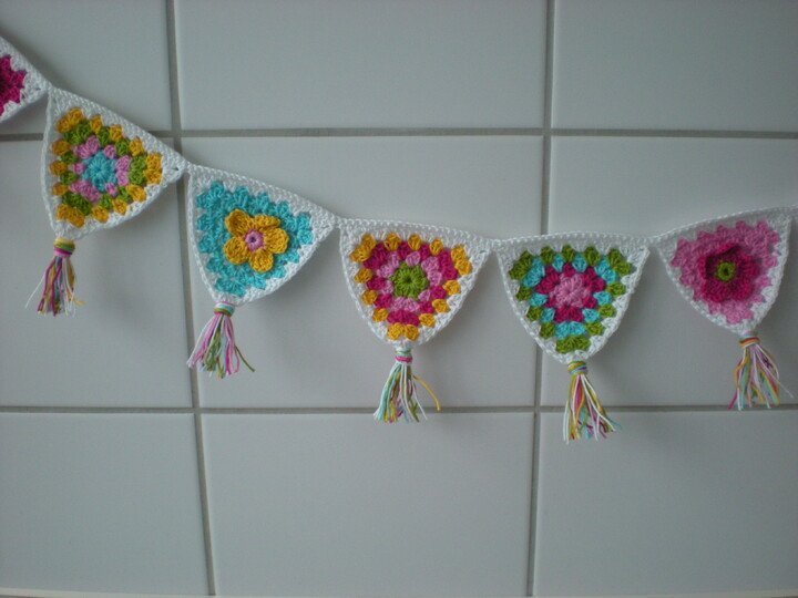 So eine farbenfrohe Girlande passt in jedes Kinderzimmer, auf den Balkon oder die Terasse, ans Fenster, über das Babybett usw. usw. Du häkelst sie einfach ein Deinen Lieblingsfarben und so breit Du möchtest.