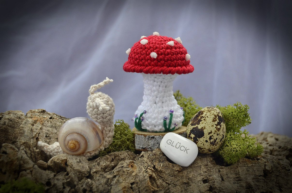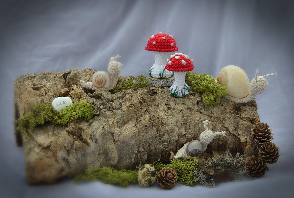 Mit dieser Häkelanleitung zeige ich dir, wie du dir diese kleinen Fliegenpilze und Schnecken in jeweils 2 Größen häkeln kannst.