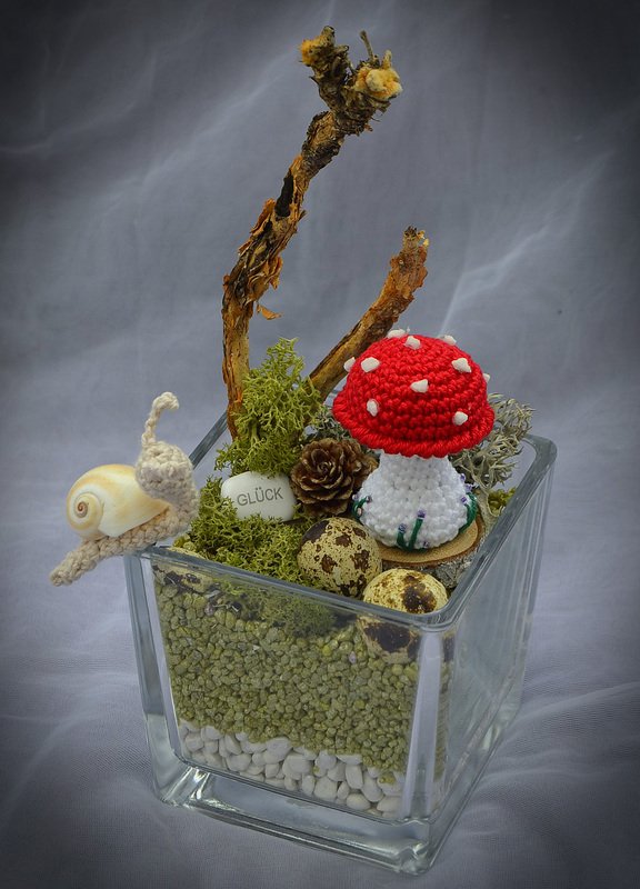 Häkelanleitung kleine Fliegenpilze und Schnecken in je 2 Größen