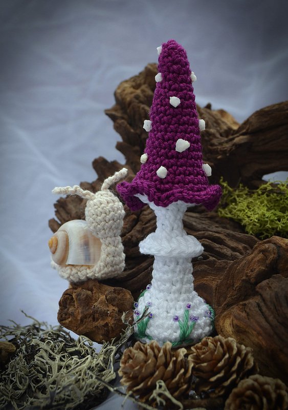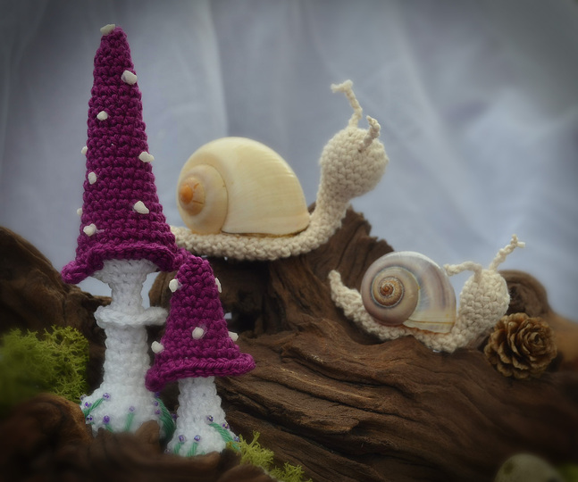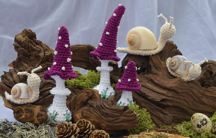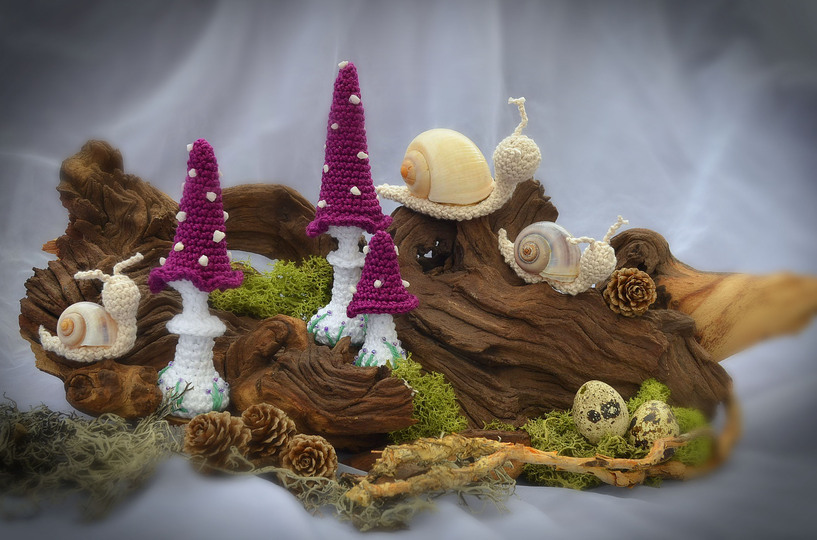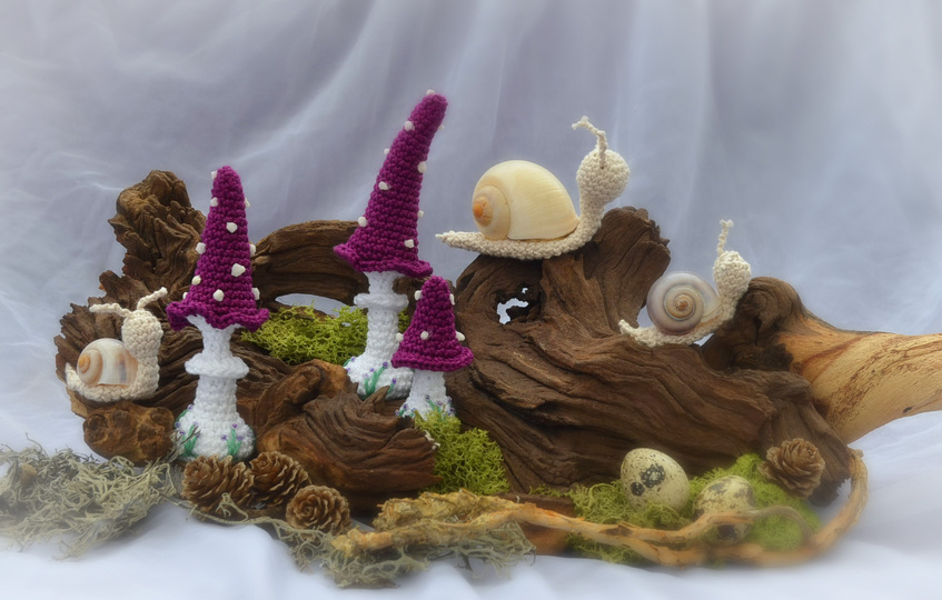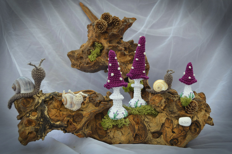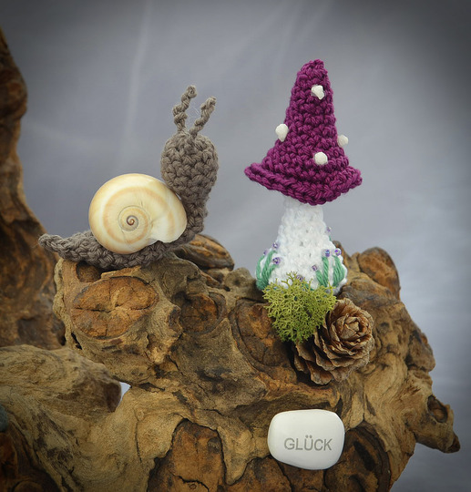 Häkelanleitung Pilze lang als 3er Set und Schnecken in je 2 Größen