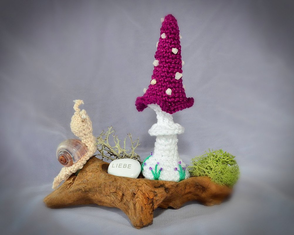 Mit dieser Häkelanleitung zeige ich dir, wie du dir diese Pilze in 3 Größen und Schnecken in jeweils 2 Größen häkeln kannst.