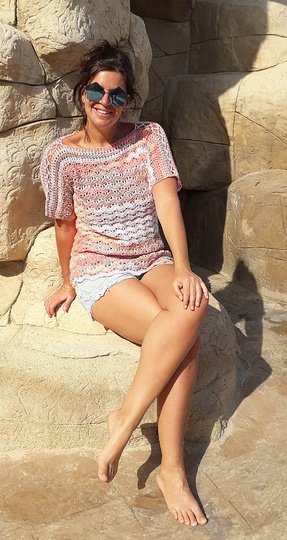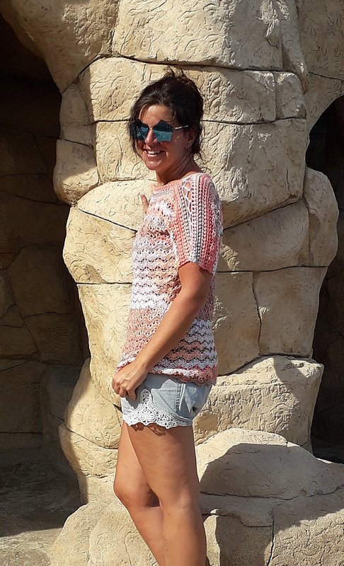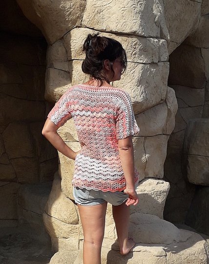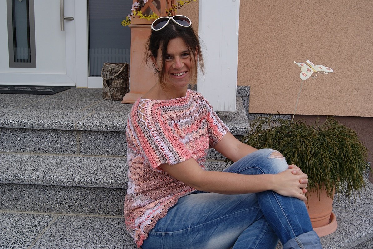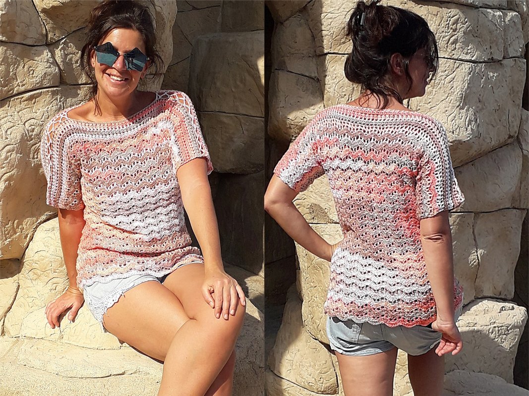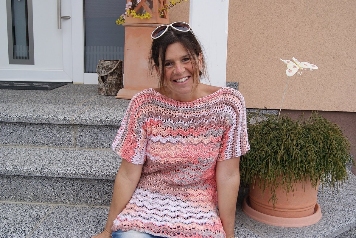 Dieses Shirt mit seinem sanften Wellenmuster besticht durch raffinierte Details und kann ohne Zunahme sowohl tailliert oder als mit geradem Verlauf gehäkelt werden. Mit seinem schönen Muster und dem lockeren Schnitt ist ganz besonders reizvoll und bequem – gleich ob unifarben oder mit Farbverlauf. Luftig lässig und elegant zugleich!