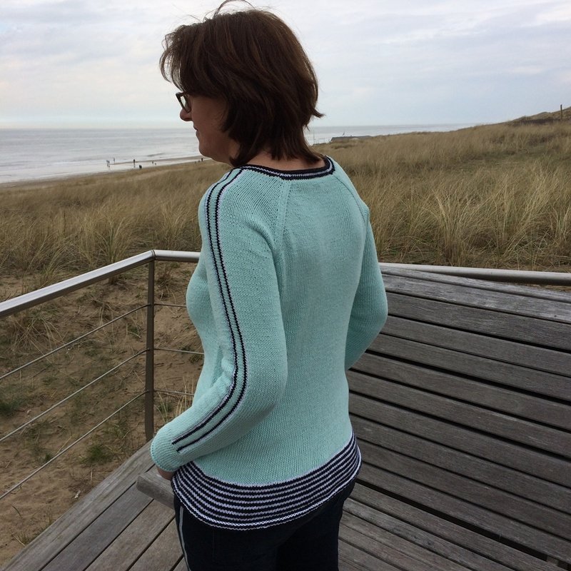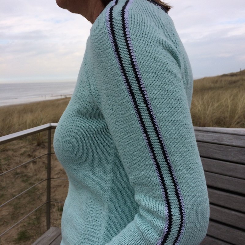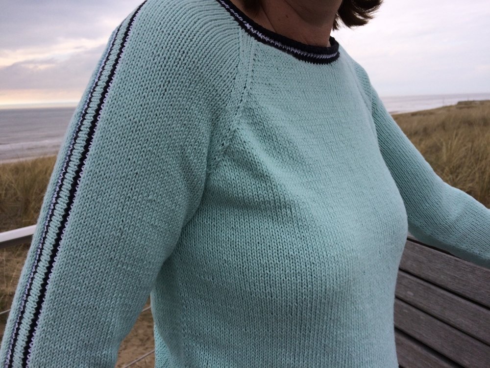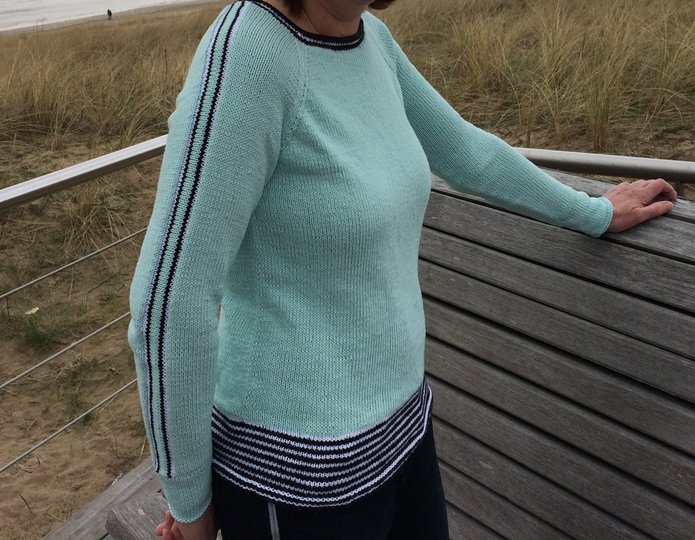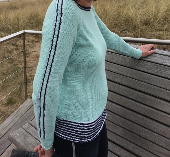Dieser Pullover ist in Sweatshirtform gestrickt und hat Kontraststreifen an den Ärmeln, ein gestreiftes langes Bündchen und eine Raglanschräge. Er wird von unten nach oben gestrickt.