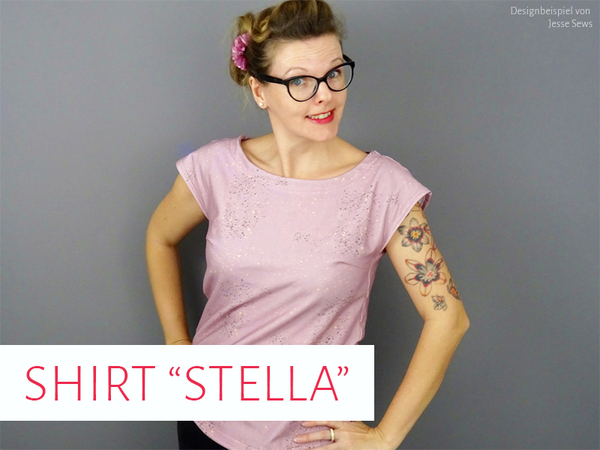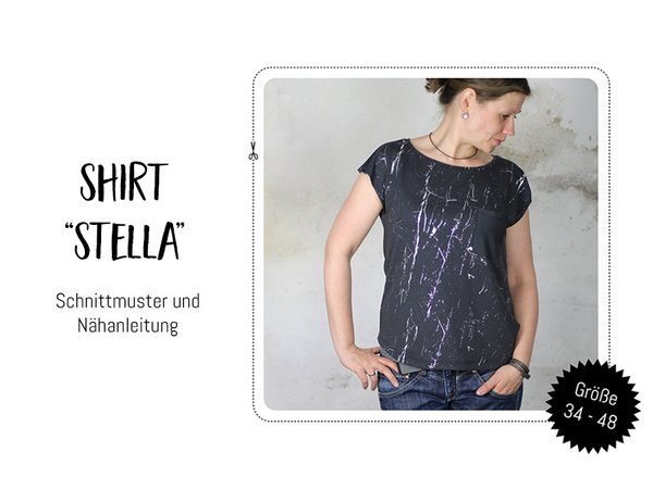 Shirt “Stella” ist ein locker geschnittenes Shirt mit überschnittenen Ärmeln und dekorativer Brusttasche. Der untere Saum ist gerundet und fällt dadurch besonders schön. Im Schnittmuster sind die Größen 34 bis 48 enthalten.