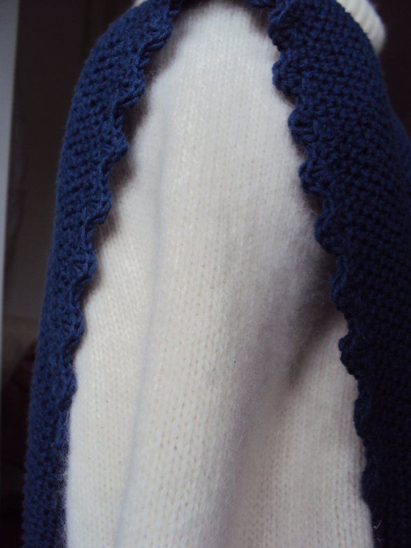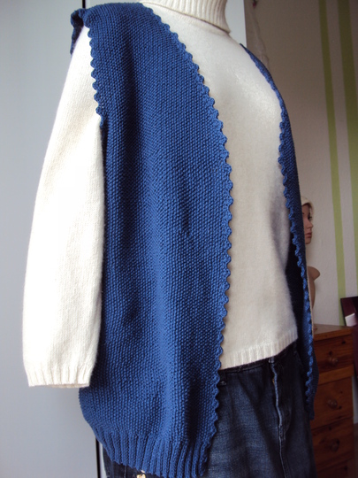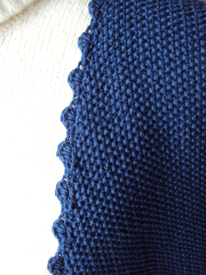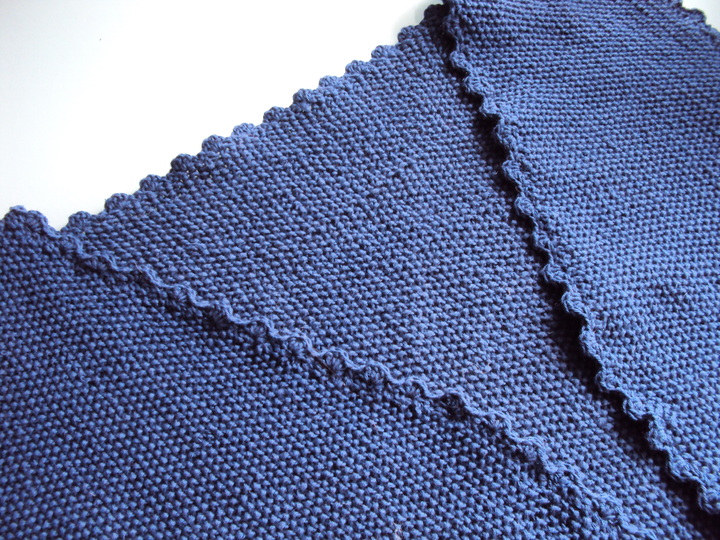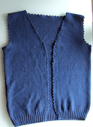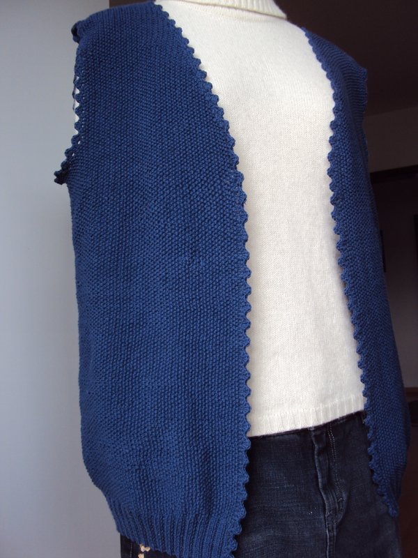 Die verschlusslose Weste wird in blauer Baumwolle im Perlmuster gestrickt. Die Kanten sind mit Mausezähnchen umhäkelt.