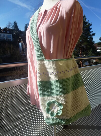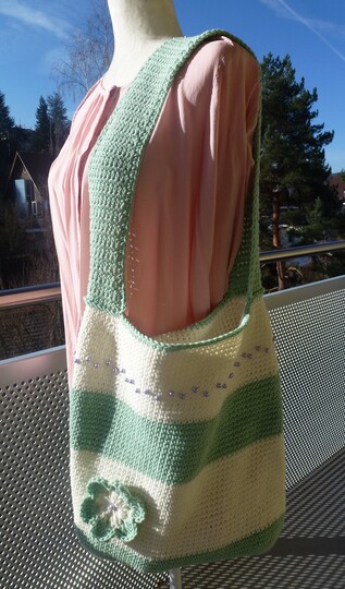 Wolle: Solé III von Gründl, 60% Baumwolle/40% Polyacryl, LL 110m auf 50g. Verbrauch: 2 Knäuel in creme und 3 Knäuel in mint.