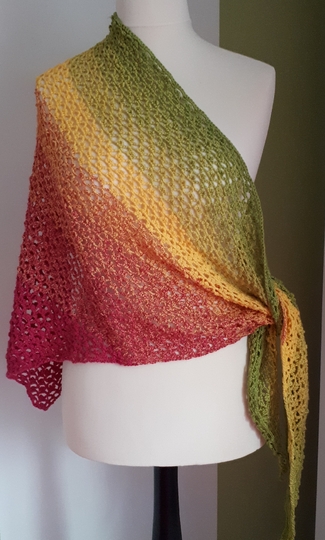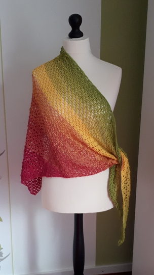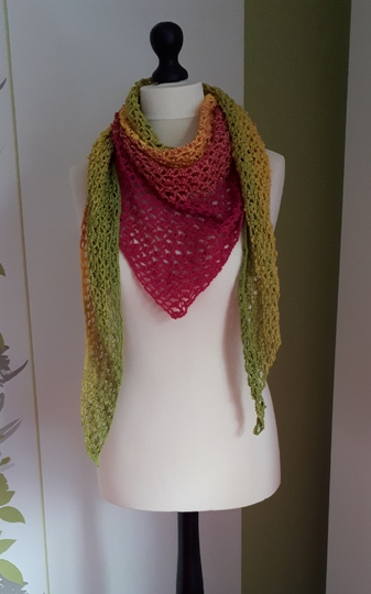 Du kannst jedes Garn verwenden. Perfekt ist jedoch Farbverlaufsgarn. Ein Bobbel gibt ein schön großes Tuch und das schlichte Muster kommt besonders gut zur Geltung.