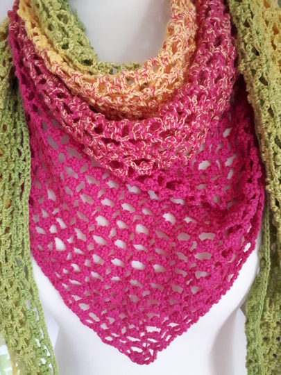Das leichte Sommertuch ist schnell gehäkelt und geht kinderleicht. Es hat nur zwei verschiedene Musterreihen und ist so auch gut unterwegs zu arbeiten. Die Größe ist variabel, einfach so lange häkeln, bis die Wolle zuende oder die gewünschte Größe erreicht ist.