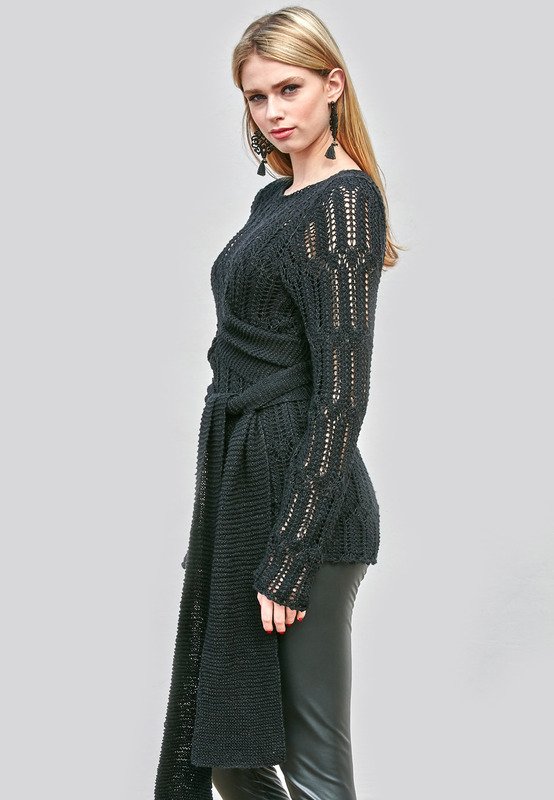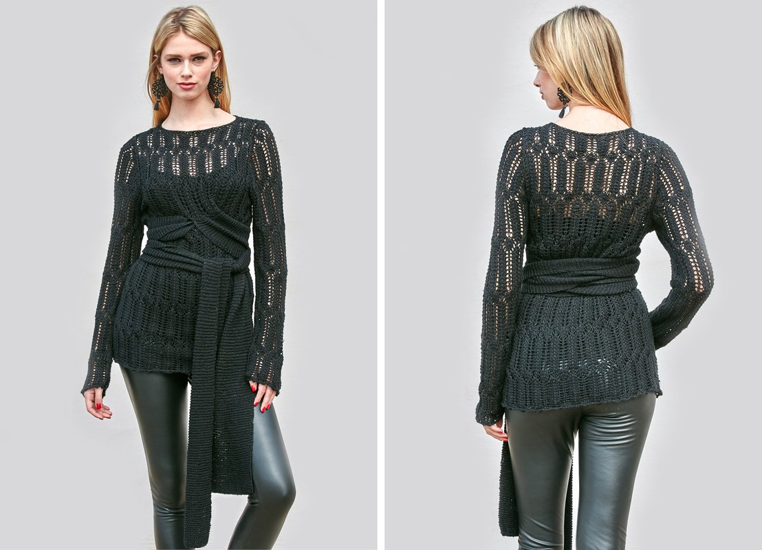 Wer den Wow-Faktor in den Genen hat, kann in diesem Frühling in die Vollen gehen. Für edle Transparenz sorgt das Ajourmuster, in Form gebracht wird das chice Teil mit einem breiten und gestrickten Wickelgürtel.