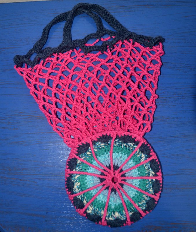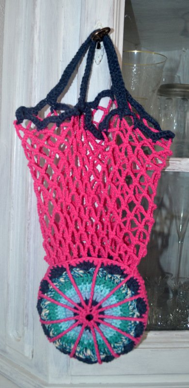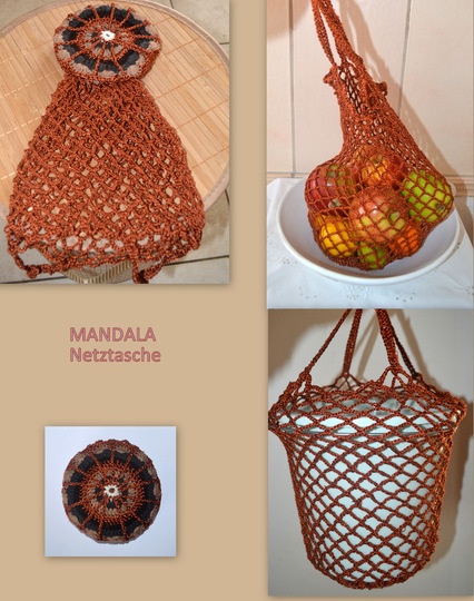 Die Anleitung ist für ein Einkaufsnetz mit doppelten Boden, das gleichzeitig als Hülle dient und in der Form einer Mandala hübsch ausschaut.