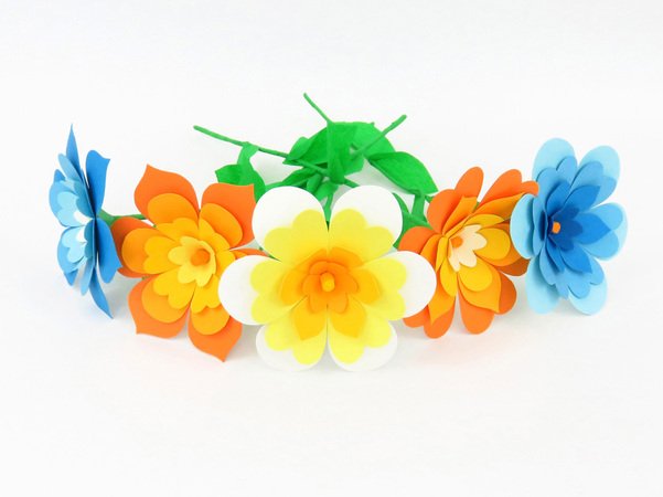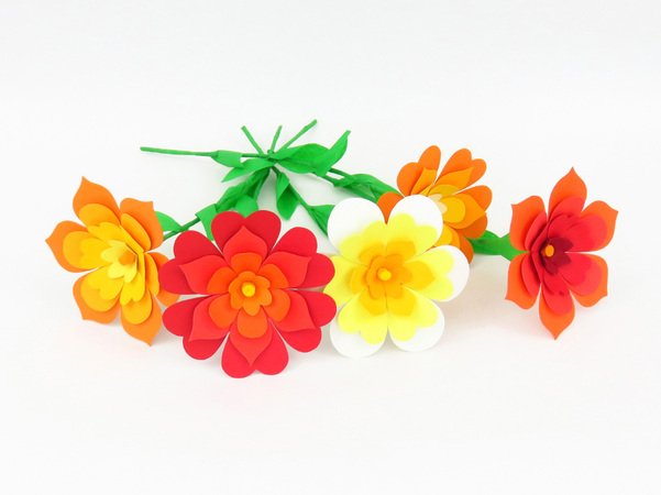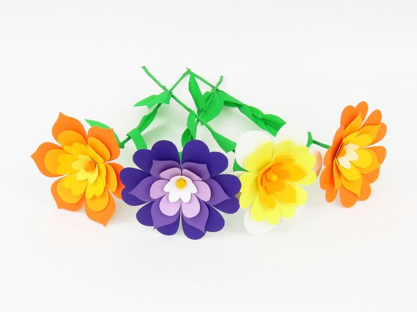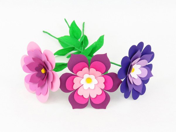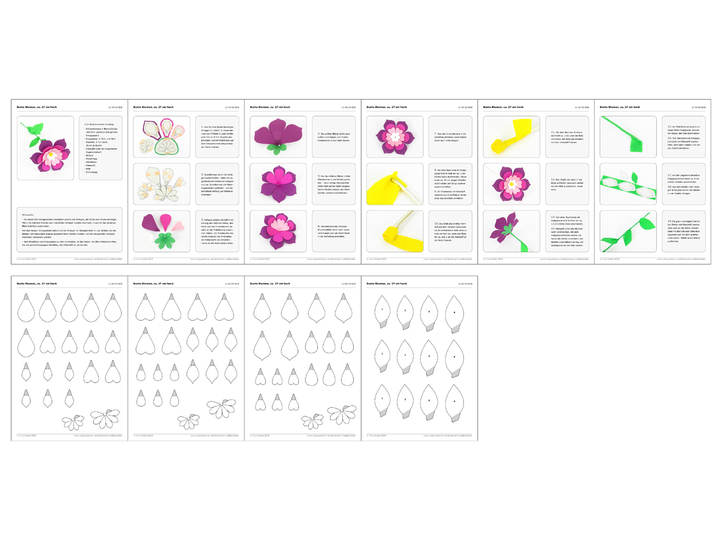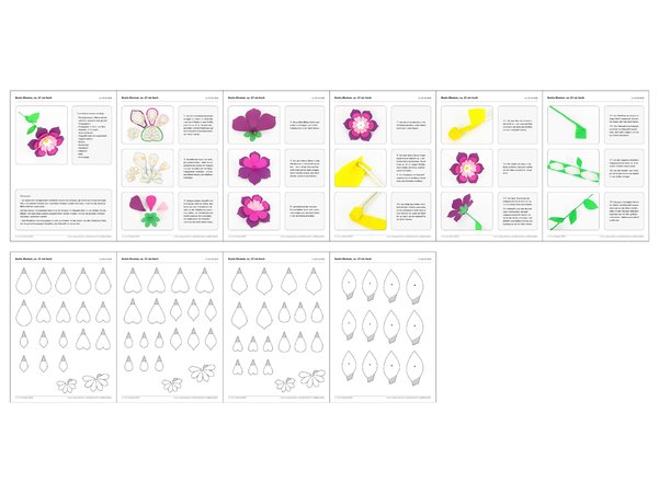 Du bekommst Vorlagen für drei verschiedene Blumen mit unterschiedlichen Blattformen für jede der drei Schichten, außerdem eine Vorlage für den Blumenkelch und eine für die Blumenmitte – die letztgenannten zwei Vorlagen sind für alle Blumen gleich. Blätterformen für den Stiel sind auch dabei.