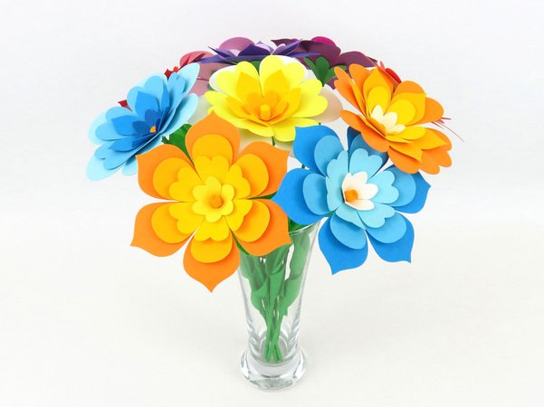 Du kannst für einen Blumenstrauß die ganze Fotokarton-Farbpalette nutzen und dabei alle möglichen Farbverläufe ausprobieren. Oder du bleibst bei ähnlichen Farben oder du bastelst alle Blumen einfarbig oder jede Schicht in einer Kontrastfarbe oder … mach es einfach, wie du möchtest!