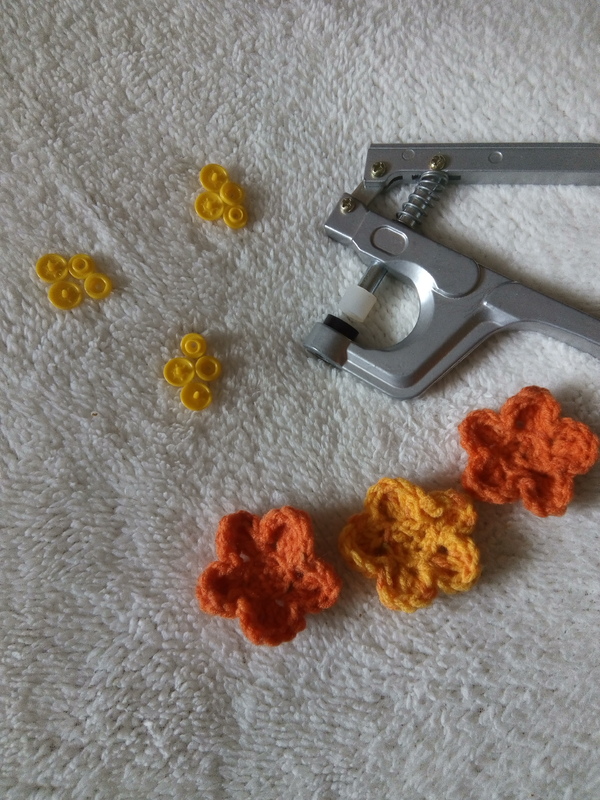 Zum Befestigen der Blüten habe ich Plastikdruckknöpfe benutzt, genausogut können sie aber auch normal angenäht werden.