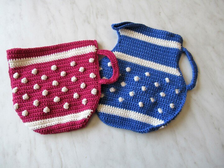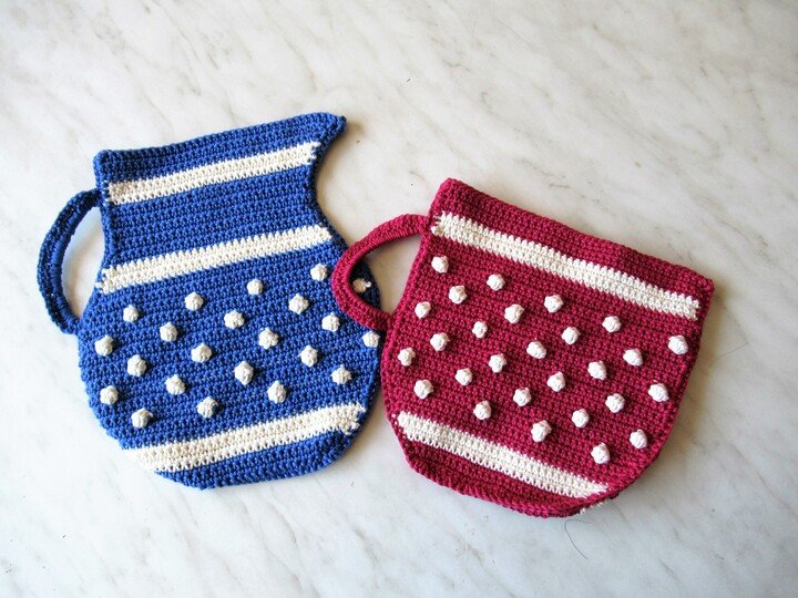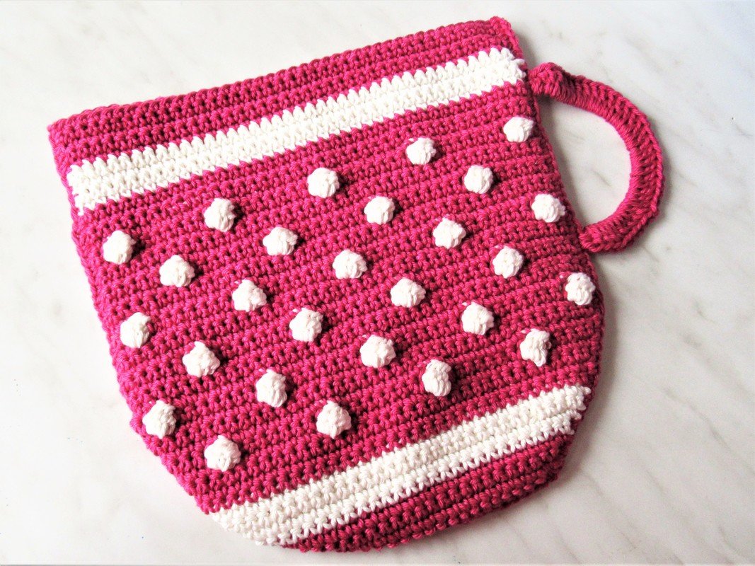Die Topflappen werden doppelt gearbeitet, so dass man von oben hineinschlüpfen kann. Sie werden aus festen Maschen gehäkelt, das Noppenmuster für die weißen Punkte wird genau erklärt.