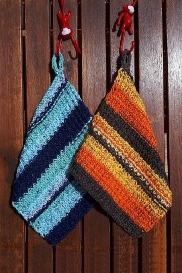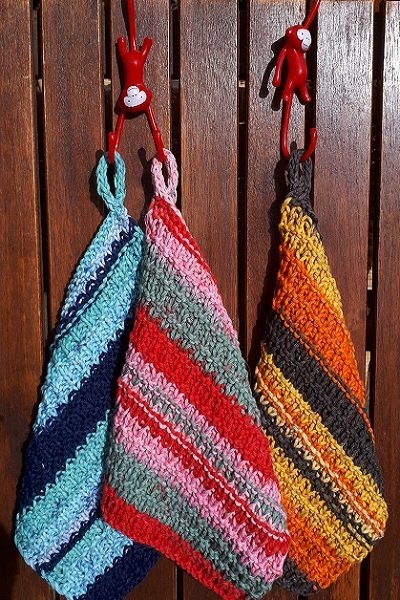 Sogar im Bad sind meine Lappen im täglichem Gebrauch. Ich verwende sie als Waschlappen oder auch um das Bad zu reinigen. Damit ich nicht durcheinader kommen, habe ich für jeden Bereich ein anderes Muster, daran erkenne ich für welchen Bereich ich die Lappen verwende.
