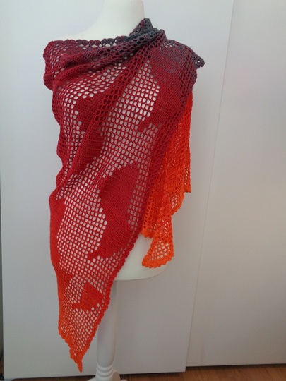 Aus nur einem Bobbel Farbverlaufswolle entspringt ein Flammenmeer, in das man sich richtig schön hineinkuscheln kann, denn mit dem angegebenen Material wird das Tuch relativ groß.