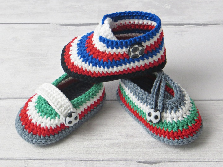 Die Anleitung ist sehr ausführlich beschrieben und bebildert und beinhaltet die Maschenangaben für 4 Größen (8,5 bis 11,5 cm Sohlenlänge). Erklärt wird natürlich auch die Fußball-Applikation. Können musst du Luftmaschen, Kettmaschen, feste Maschen, halbe Stäbchen und Zu-und Abnahmen.