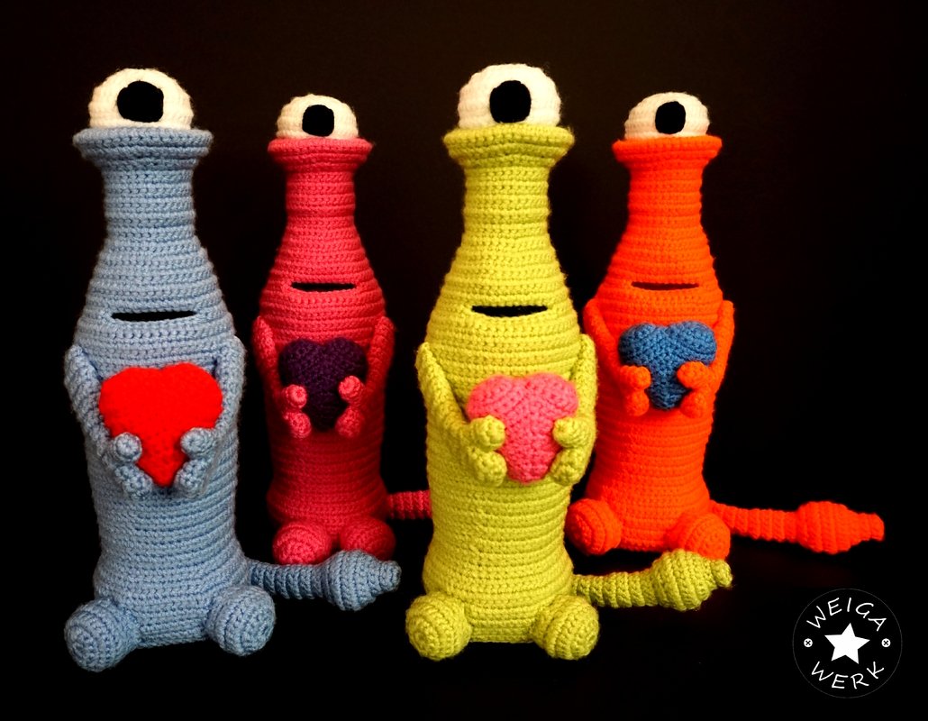 ich habe gerade mit dem süßen Monster angefangen. Nur frage ich mich gerade ob die Spardose praktikabel ist für Kinder. Ich befürchte man hält nur noch den Häkelkörper in der hand und die Flasche fällt unten raus....oder?