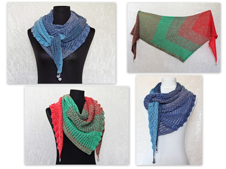 Die Größe des fertigen Tuches ist abhängig von der gewählten Garnmenge. Bei einem Verbrauch von ca. 1000 Meter Wolle wird das Tuch ca. 2,20 Meter x 70 cm groß. Weniger Laufmeter ergeben ein kleineres Tuch.