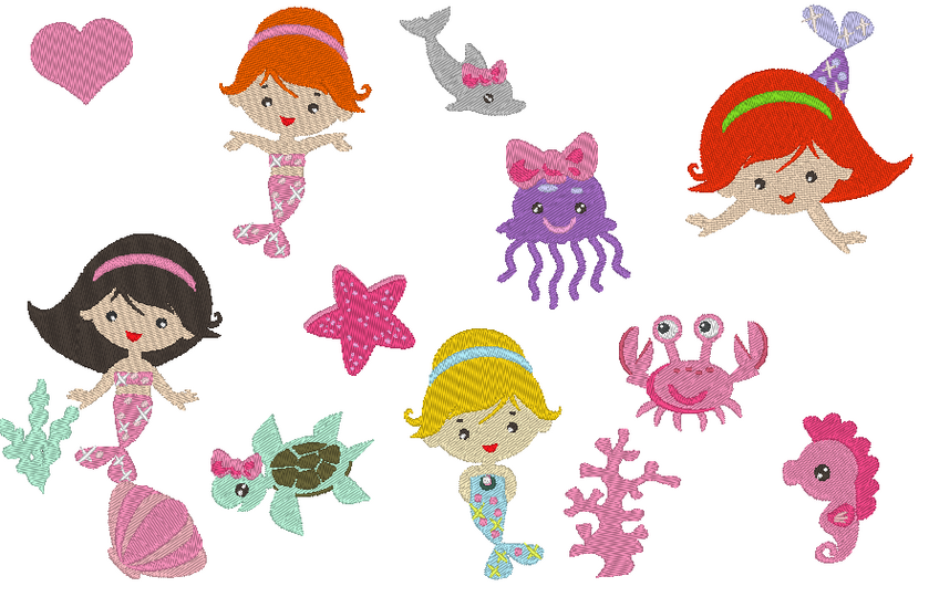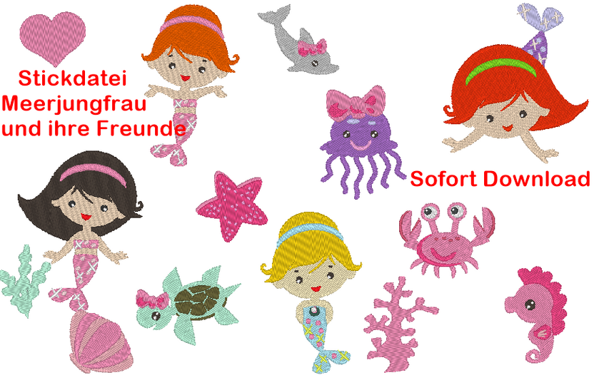 4 allerliebste Meerjungfrauen und Ihre Freude die Schildkröte, Qualle, Seepferdchen, Krebs und Seestern