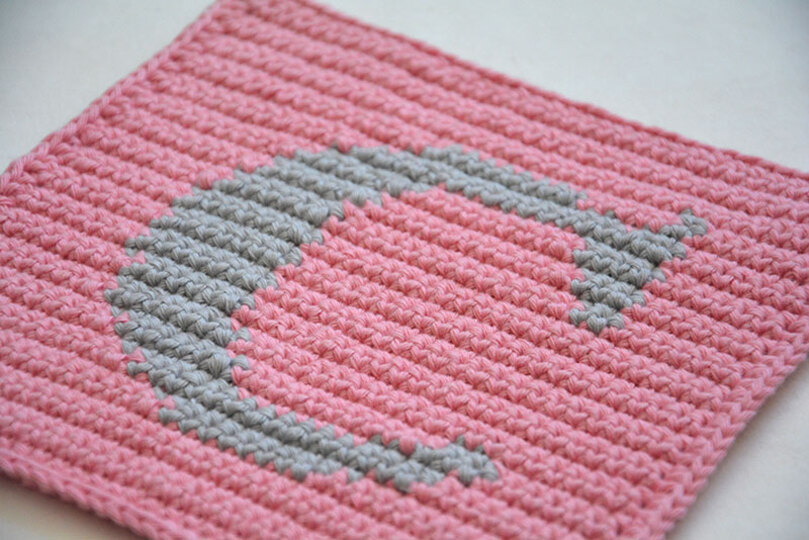 Neben der schriftlichen Anleitung für den Buchstaben-Topflappen sind ein Häkelschema in Farbe und ein Häkelschema in schwarz-weiß enthalten.