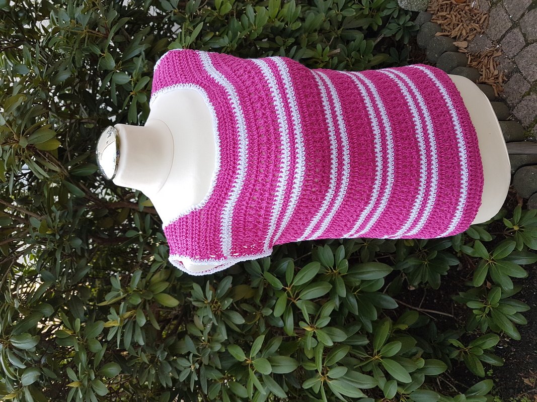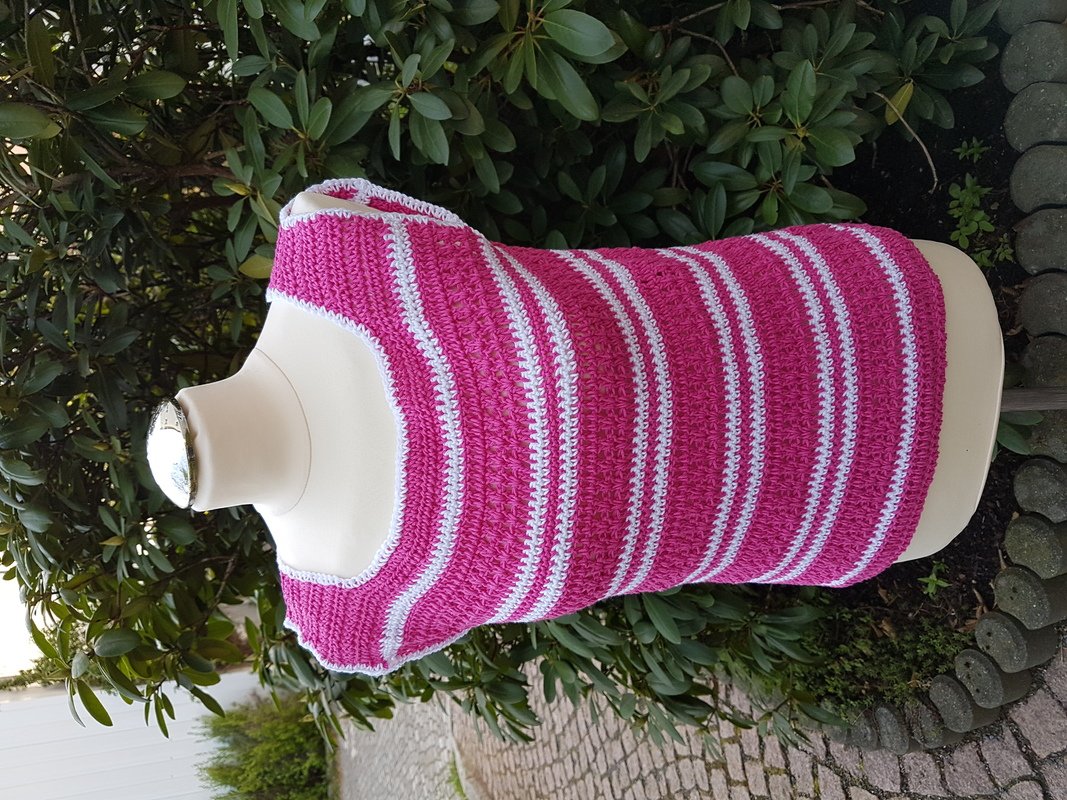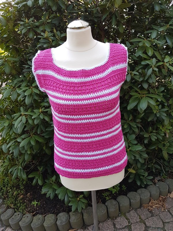 Dies ist die schriftliche und ausführliche Anleitung für das schöne Sommertop Triangel. Es ist in jedem Fall anfängertauglich und auch auf andere Garne oder spezielle Größenanforderung umzurechnen. Die 4 gängingen Größen S, L, M, XL sind alle einzeln angegeben. Reihe für Reihe kann nachgearbeitet werden. Durch Fotos unterstützt ist es sehr einfach sich ein solch schönes Top zu häkeln. Verwendet wurde 4 x Catania von Schachenmayr in der Hauptfarbe und 3 x in der Kontrastfarbe. Catania hat gemäß Herstellerangabe 125 m Lauflänge auf 50 g. Außerdem benötigt man eine Häkelnadel und eine Nähnadel. Durch die vielseitige Farbauswahl bei Catania kann sich jeder seine Lieblingsfarben aussuchen.