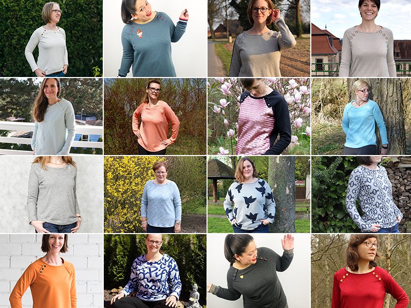 Zum Nähen eignen sich Jersey und Strickstoffe, die gut dehnbar sind. Festere Stoffe wie Sweat sind nicht so gut geeignet, da sich durch den Raglanschnitt an den Schultern bei wenig Dehnbarkeit der Pulli nach oben zieht.