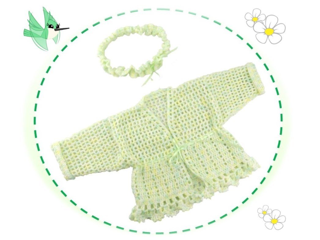Dieses entzückende Jäckchen mit passenden Stirnband eignet sich hervorragend als Willkommensgeschenk für kleine Erdenbürger und läßt garantiert alle Herzen höher schlagen.
