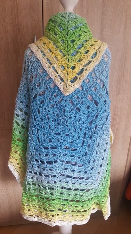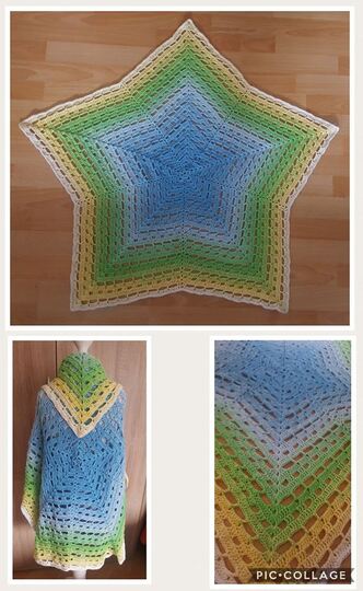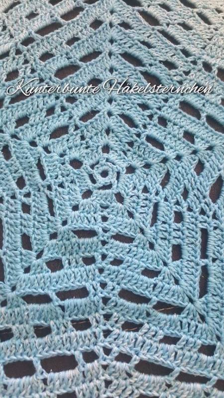 Es handelt sich um eine tolle Sternchendecke von Kunterbunte Häkelsternchen, die aus Stb und Lm besteht. Mein Sternchen habe ich mit einer 3,5er Nadel gehäkelt und habe 760m Wolle mit Lurex 4 fädig verarbeitet. Das Sternchen ist von linker zur rechter Spitze 98 cm groß geworden.