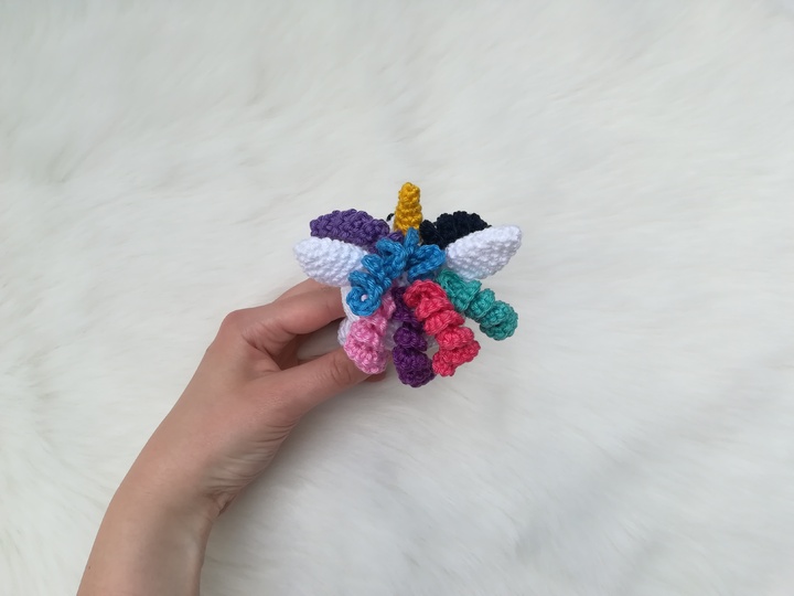 Mit Häkelnadel 3,0 mm und der Schachenmayr Catania Wolle wird die Einhorn Rassel 12 cm groß.