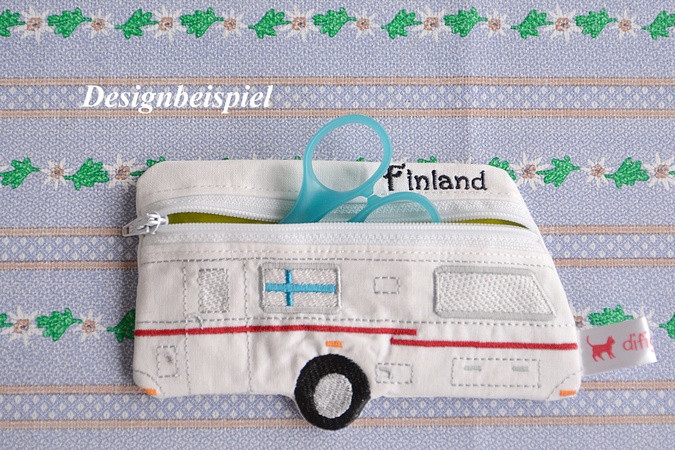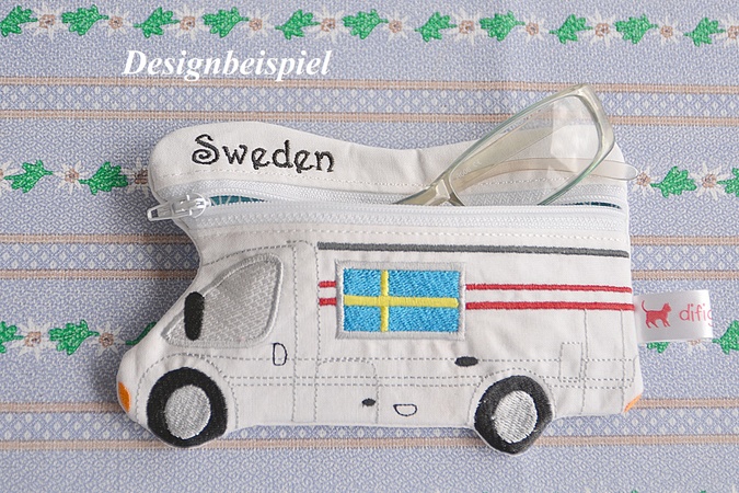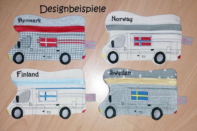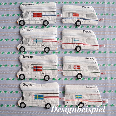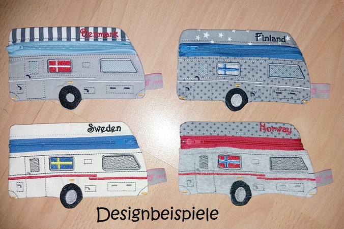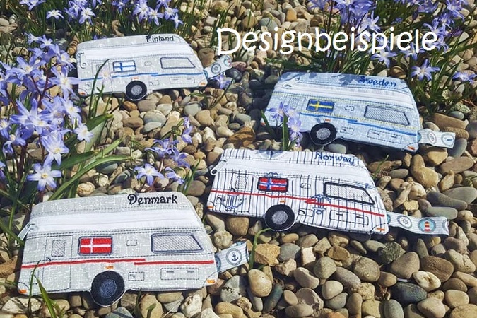 Geliefert werden 8 Stickdateien, davon 4 ITH - Taschen in Wohnmobilform und 4 ITH - Taschen in Wohnwagenform.