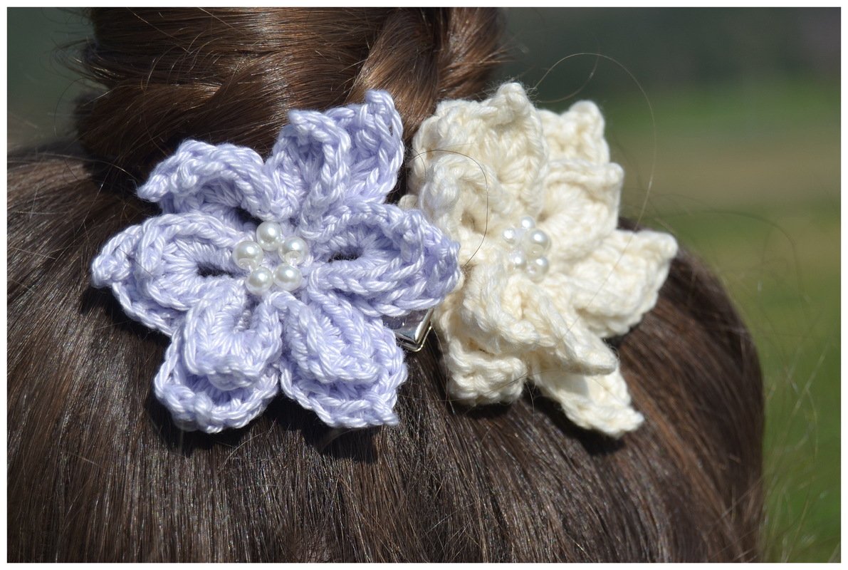 Ich habe die Blüte hier in champagner mit den passenden Perlen gehäkelt, aber in bunten fröhlichen Farben passen sie auch zu einer lässigen Alltagsfrisur oder als Streudeko oder Geschenkverpackung, deiner Kreativität sind keine Grenzen gesetzt.