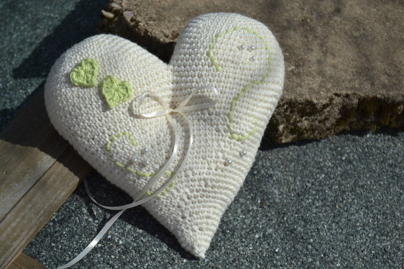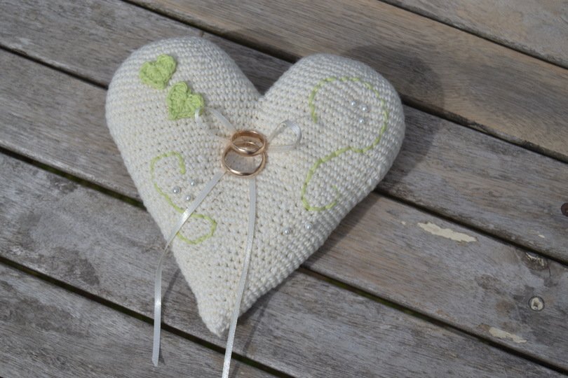 Da meine Cousine dieses Jahr heiratet, wollte ich sie mit einem besonderen Geschenk überraschen und habe passend zu Ihrem Kleid, ihrem Schmuck und ihrer Wunschfarbe dieses herzförmige Ringkissen gehäkelt.