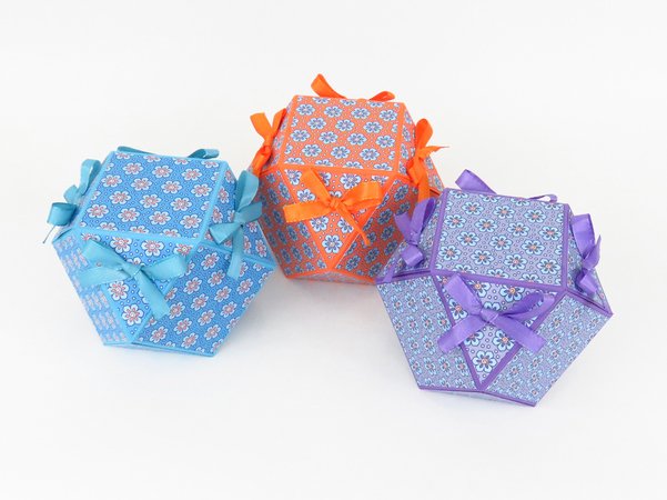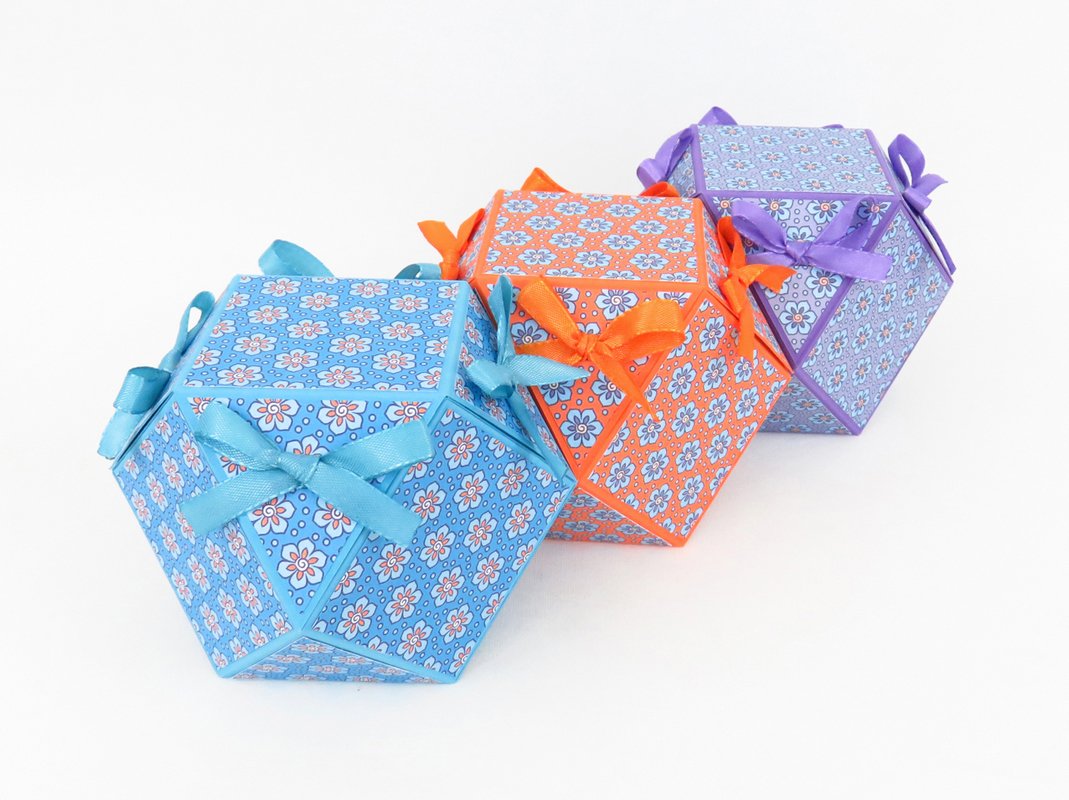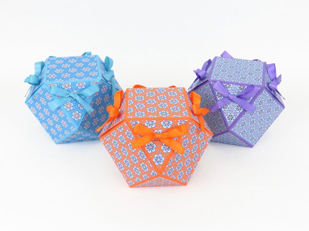 Mit dieser Vorlage bekommst du auf jeden Fall eine ungewöhnliche Schachtelform, aber das Papier, mit dem du die Schachtel beklebst, spielt hier die Hauptrolle und bietet dir beinahe unendliche Gestaltungsmöglichkeiten.
