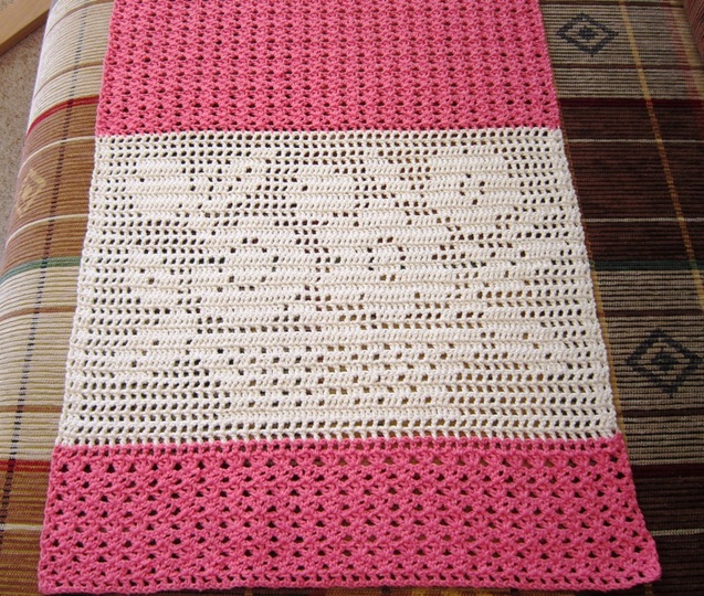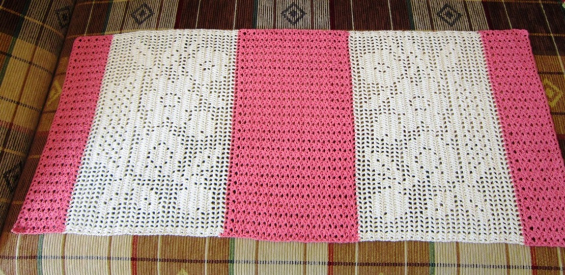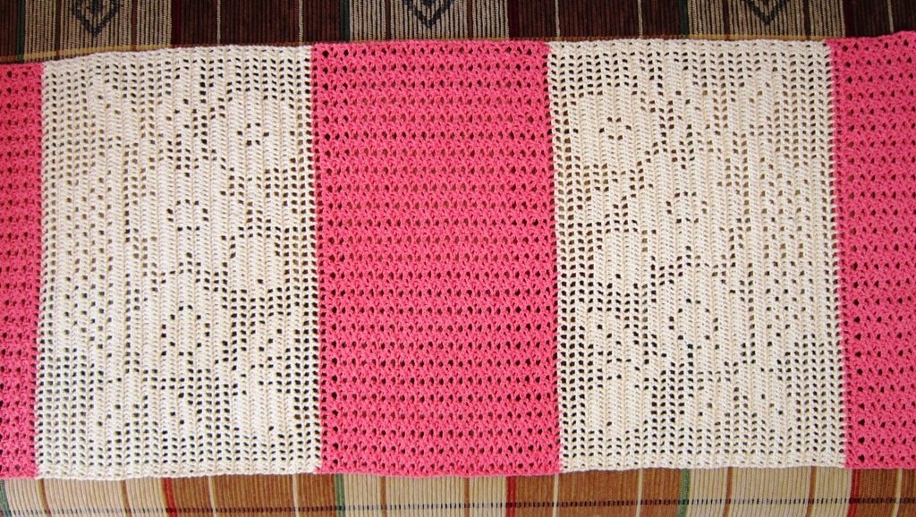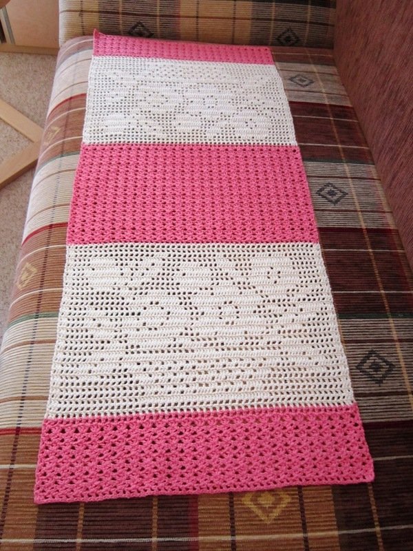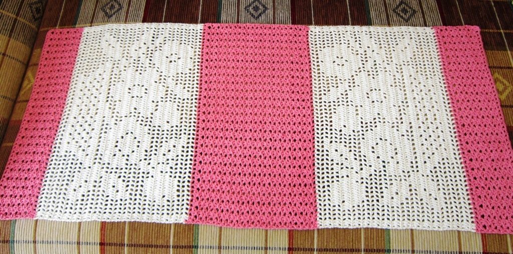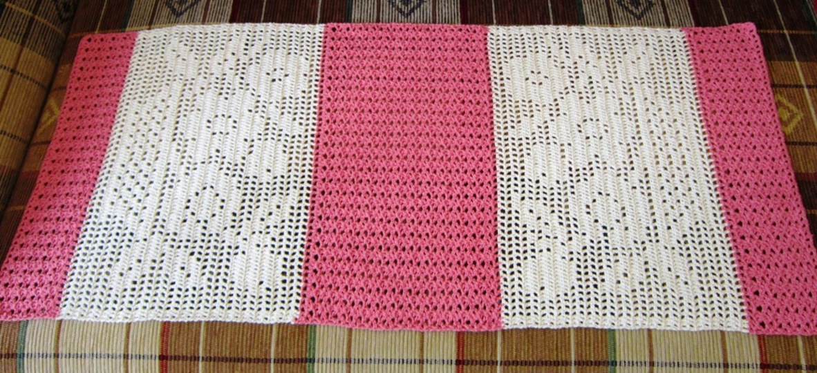 Bei mir ist der Tischläufer 98 x 46 cm groß. Gehäkelt habe ich ihn mit einer Häkelnadel 3,0 und einem Baumwollgarn 125m /50g. Die Anleitung umfasst 20 Seiten und enthält zahlreiche Bilder. Das 2-seitige Zählmuster wurde am PC erstellt.