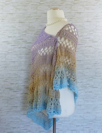 Das Tuch ist mit einer schöner Farbverlaufswolle ein optisches Highlight. Das Lochmuster lockert das Ganze noch auf. Wenn es schön locker gehäkelt wird, ist es ein super toller Halsschmeichler.