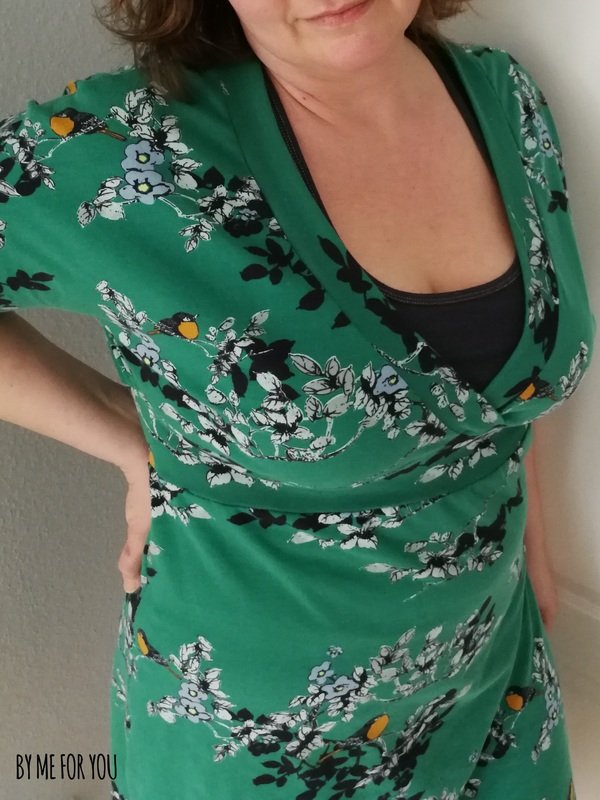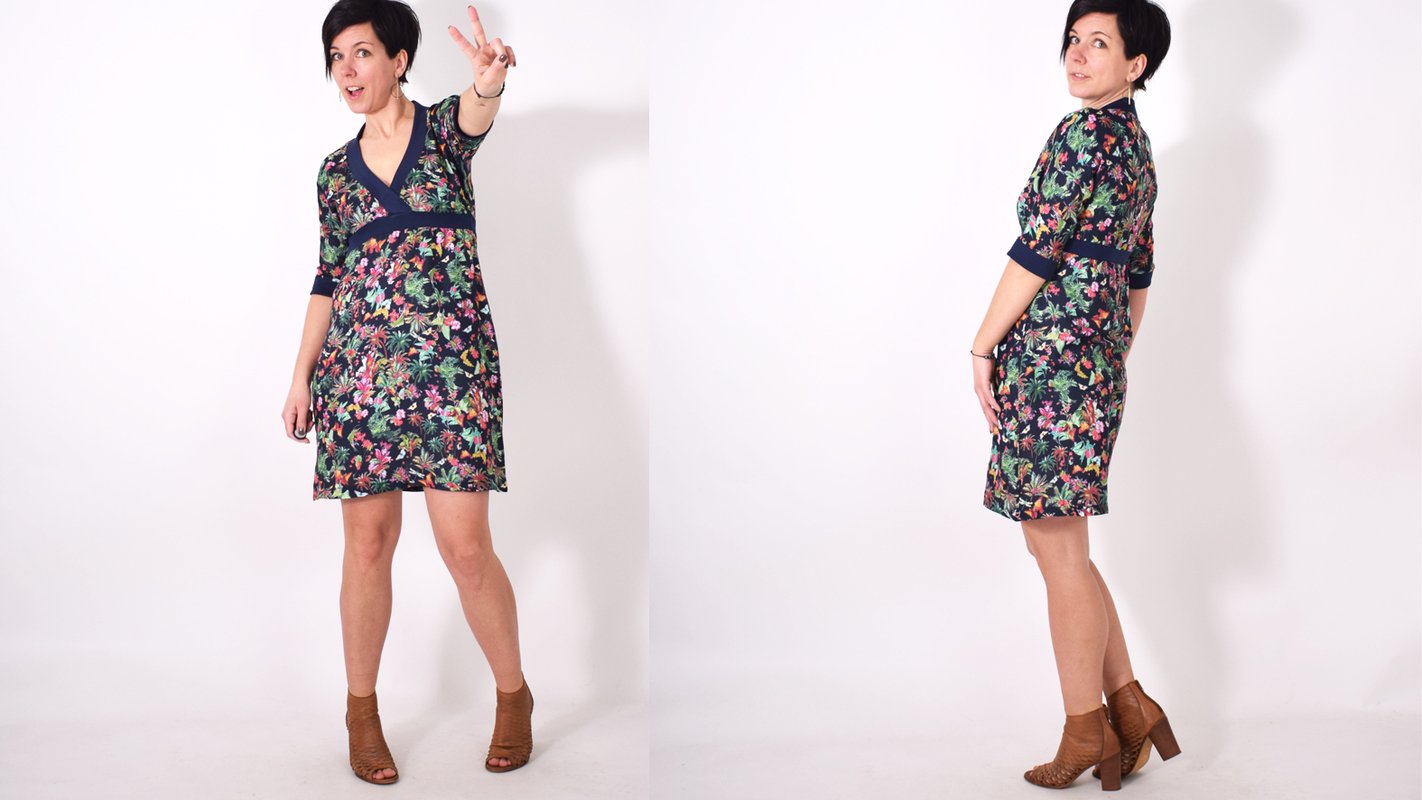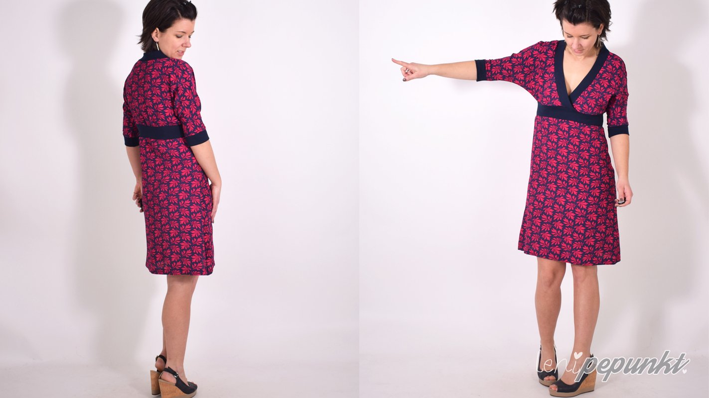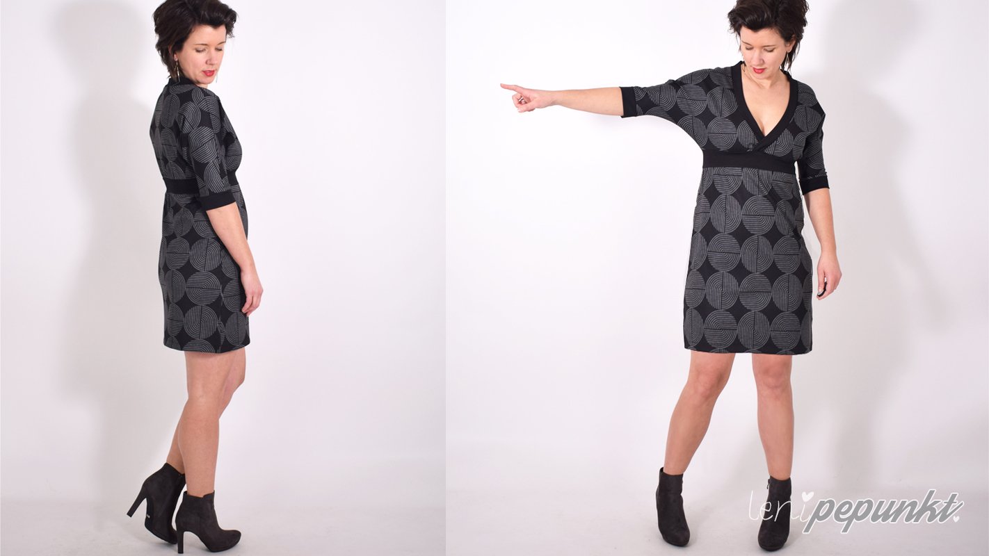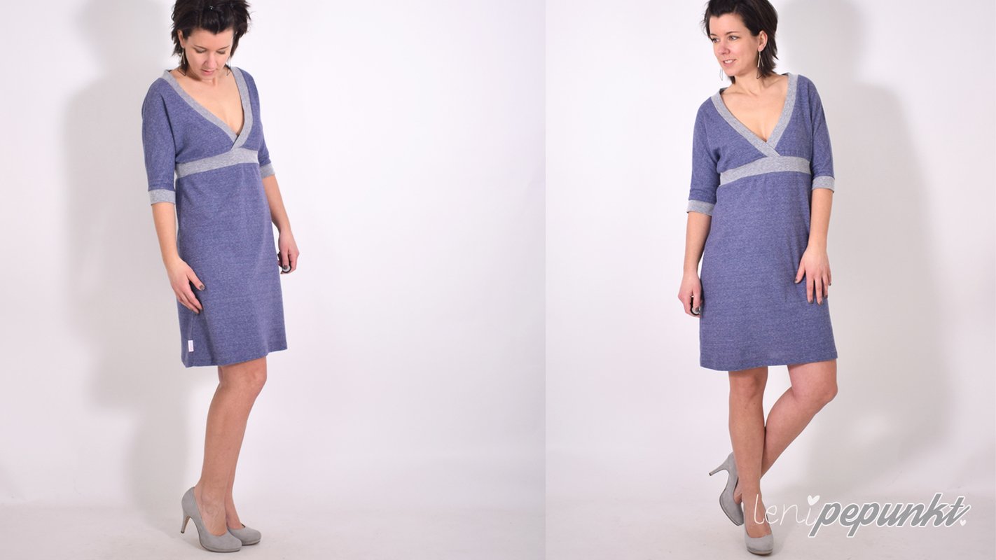 Das Oberteil hat eine Wickeloptik, die durch das Übereinandernähen der beiden Vorderteile erzielt wird. Lässige Fledermausärmel und schmale Bündchen am halben Ärmel machen das Kleid zum absoluten Lieblingsteil.