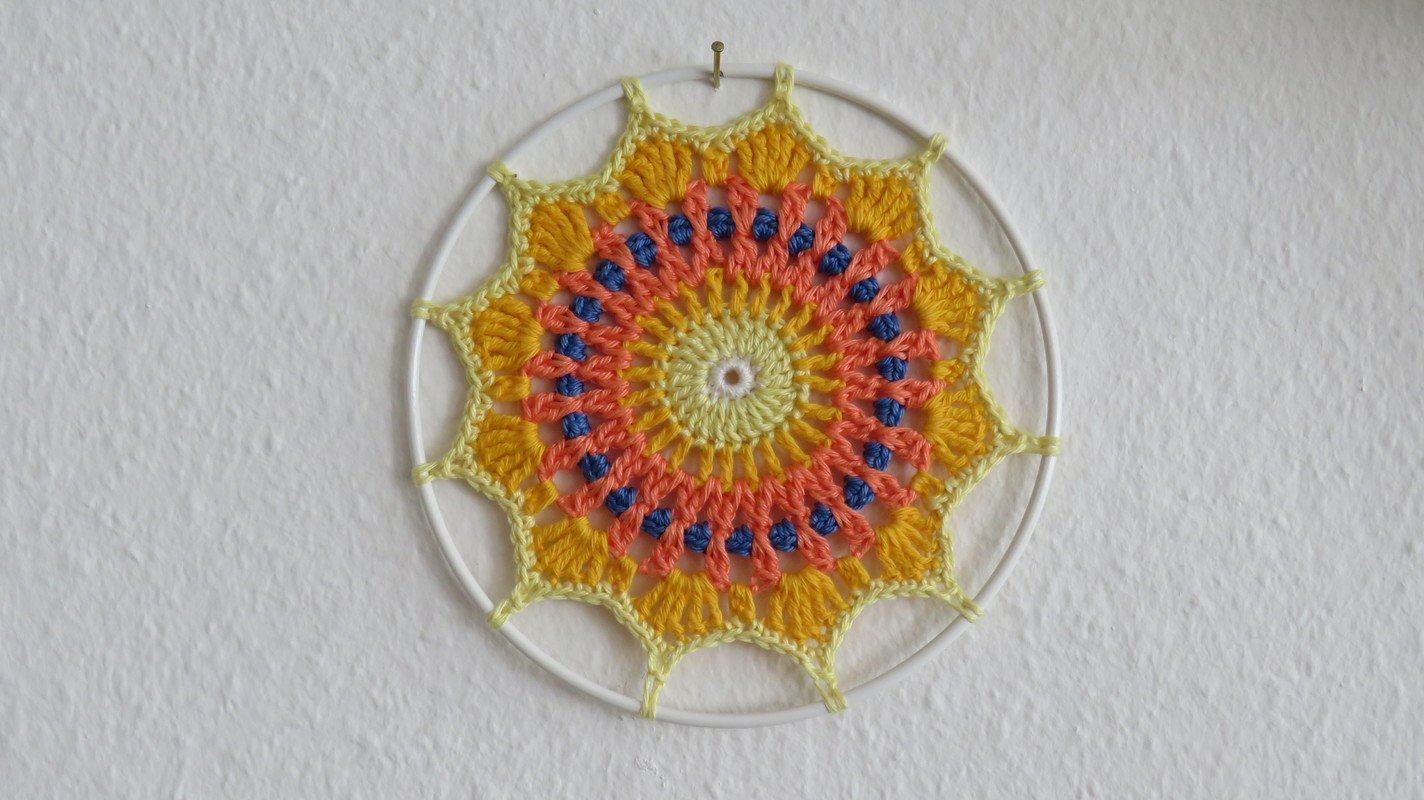 Herzlich willkommen zu meiner Anleitung für dieses schöne Mandala, das gar nicht schwer zu häkeln ist und den Sommer mit leuchtenden Farben begrüßt.